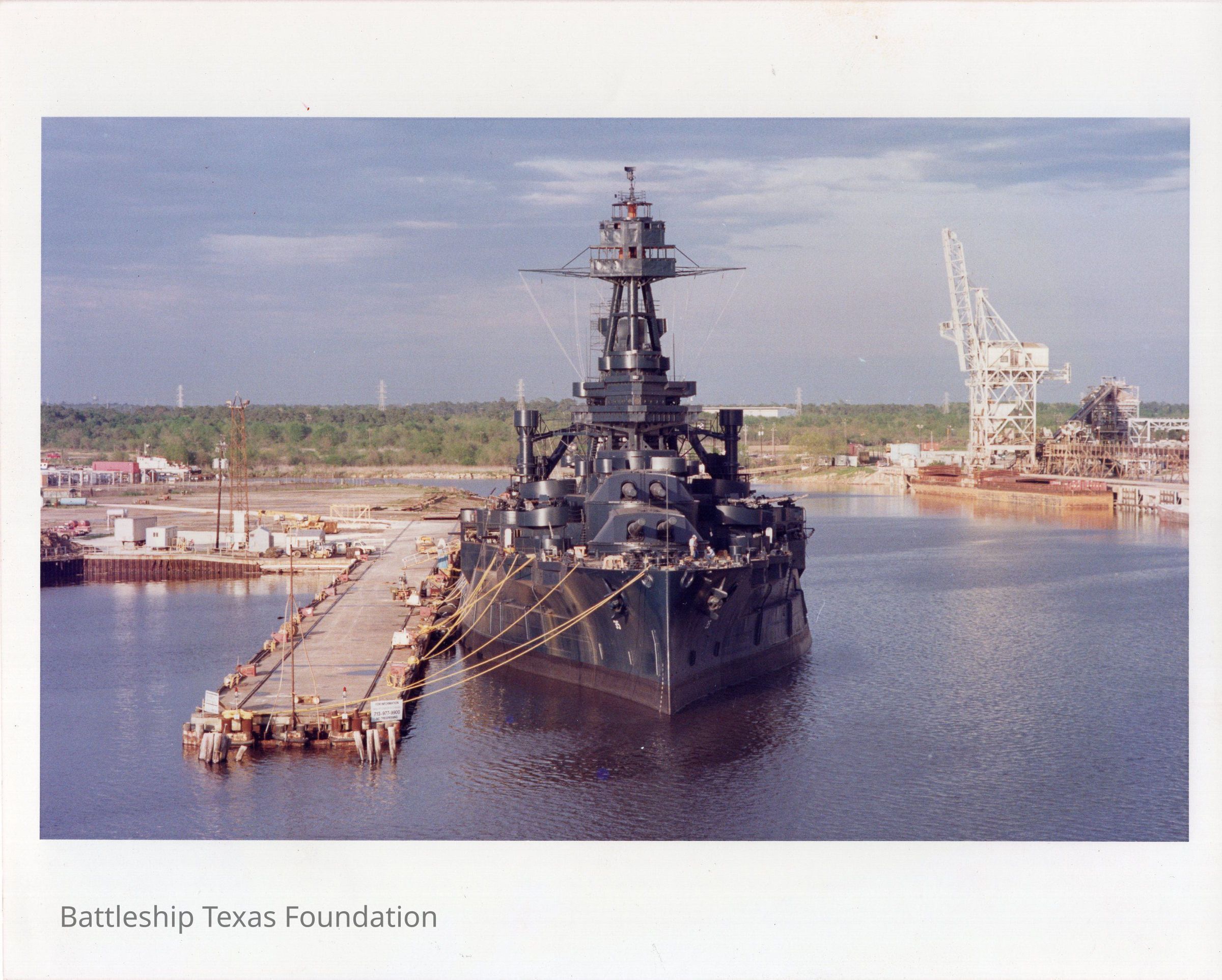 Texas bow on, moored on her starboard side. Crane on right of photo.Context