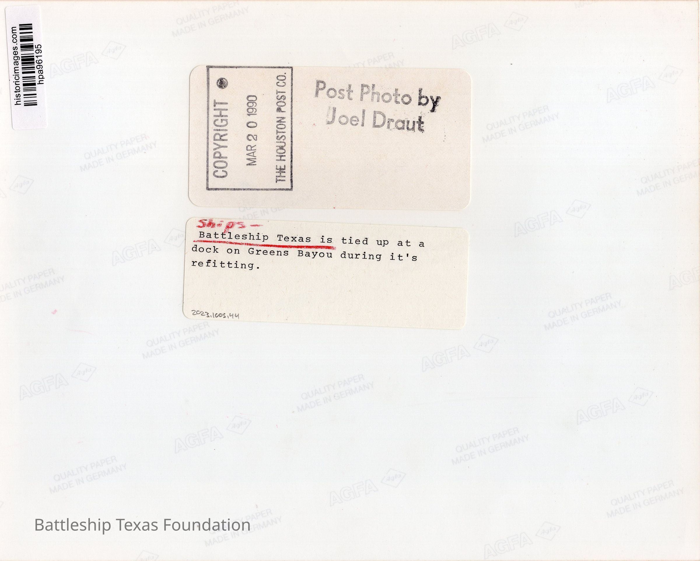 Battleship Texas departed San Jacinto State Park for Todd Shipyard in Galveston where she had hull work in dry dock from December 13, 1988, to August 6, 1989, and then put back in water for additional work through February 23, 1990. She was moved to Green’s Bayou for decking and monopile instillation and returned to San Jacinto Battleground on July 28, 1990. The Battleship Texas Museum was operated by the Texas Parks and Wildlife Department from 1983 to 2020.Collection