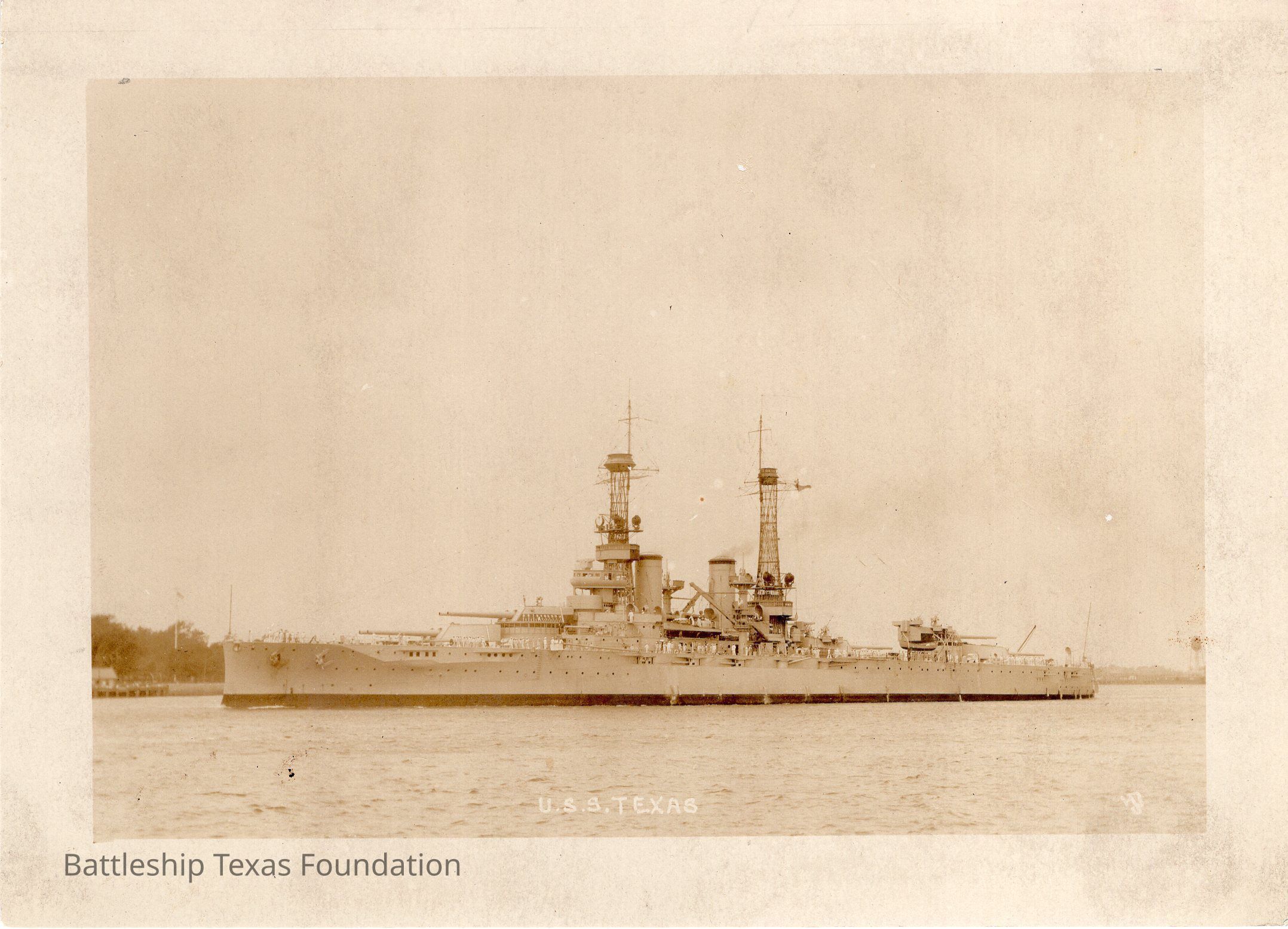 Texas portside with cage masts. Pier in background. Captioned "U.S.S. TEXAS"Context