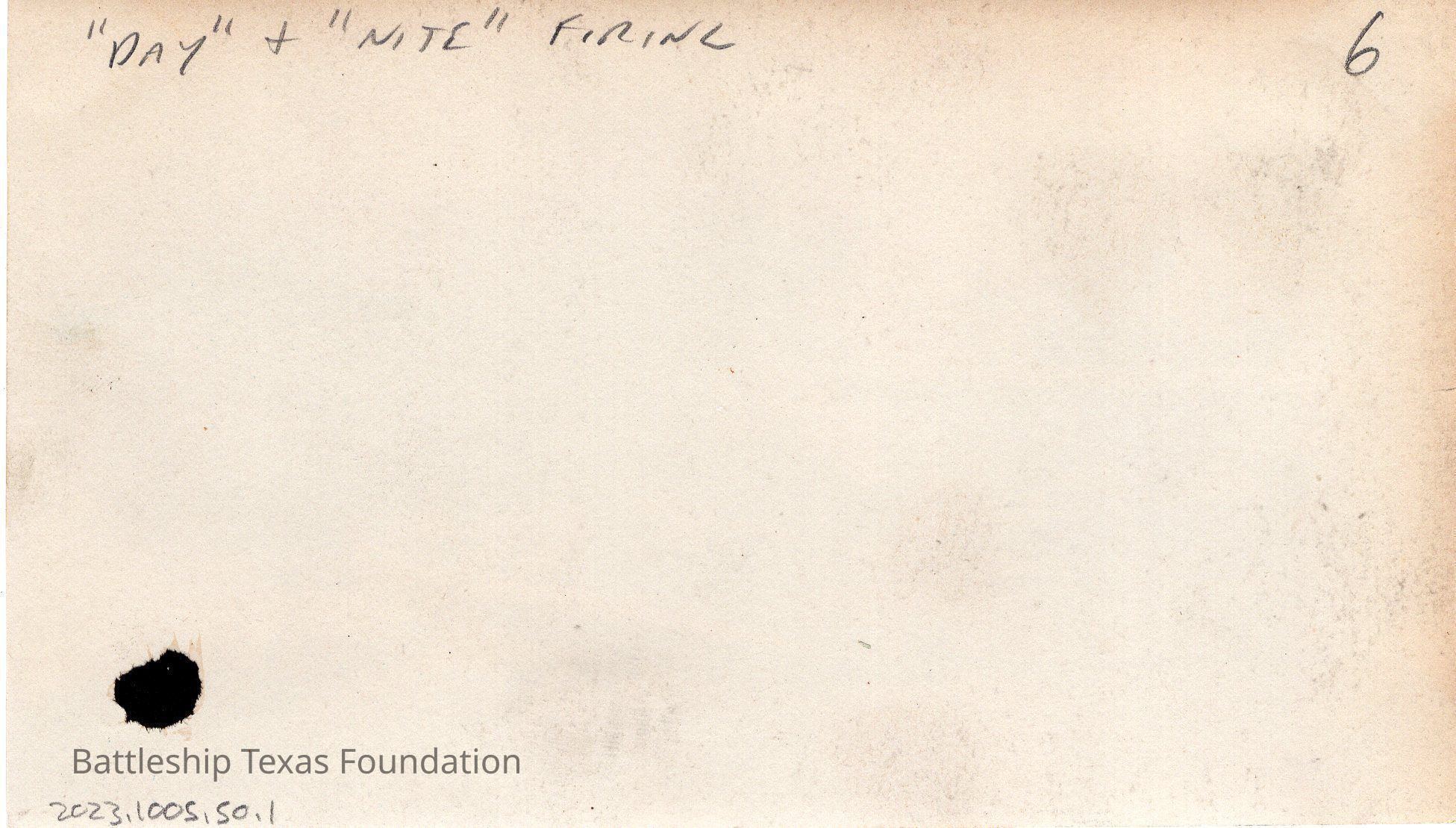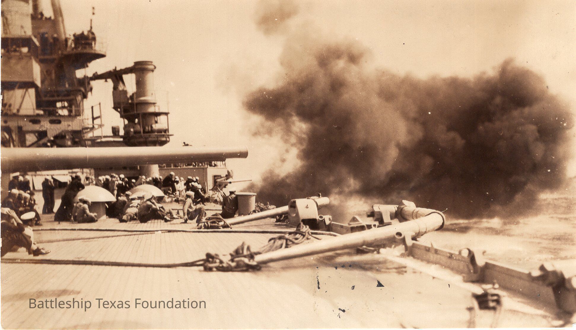 Texas to left, smoke from firing to right. Turret 3 turned to starboard