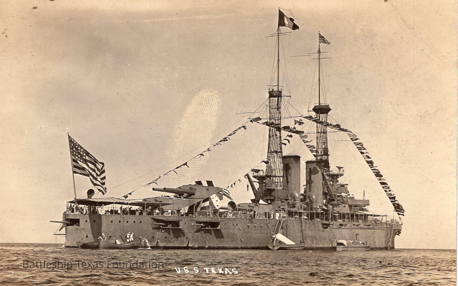 Texas in dress with row of flags going up starboard side and port side. Large US flag on stern. Fingerprint on photo above Turret #4. Stinger. Open ocean.Context