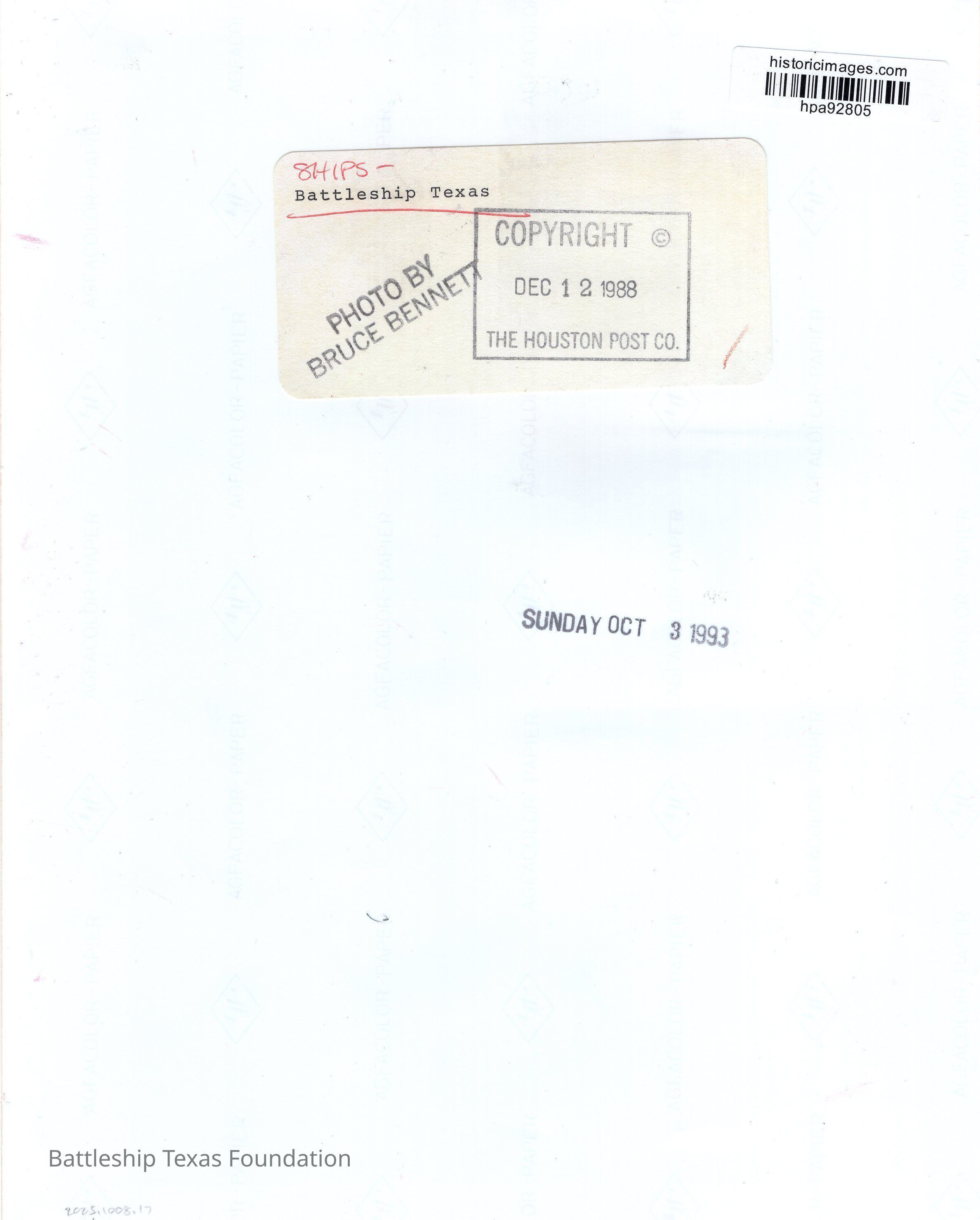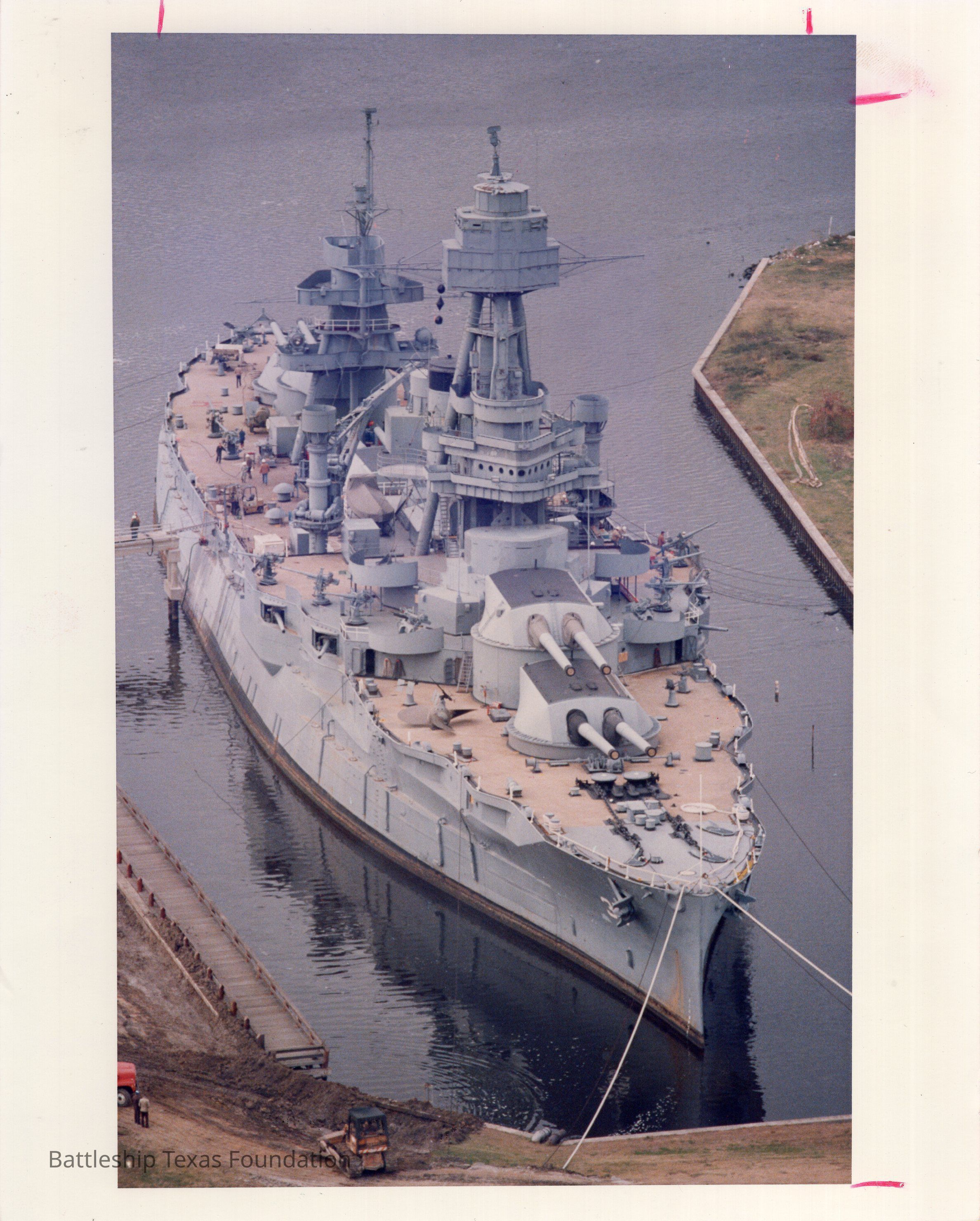 1988 shot of Texas in haze gray at the San Jacinto slip. Photo copyrighted on December 12, 1988. Also has a stamp for October 3, 1993, likely when it was used in the Houston Chronicle.Context