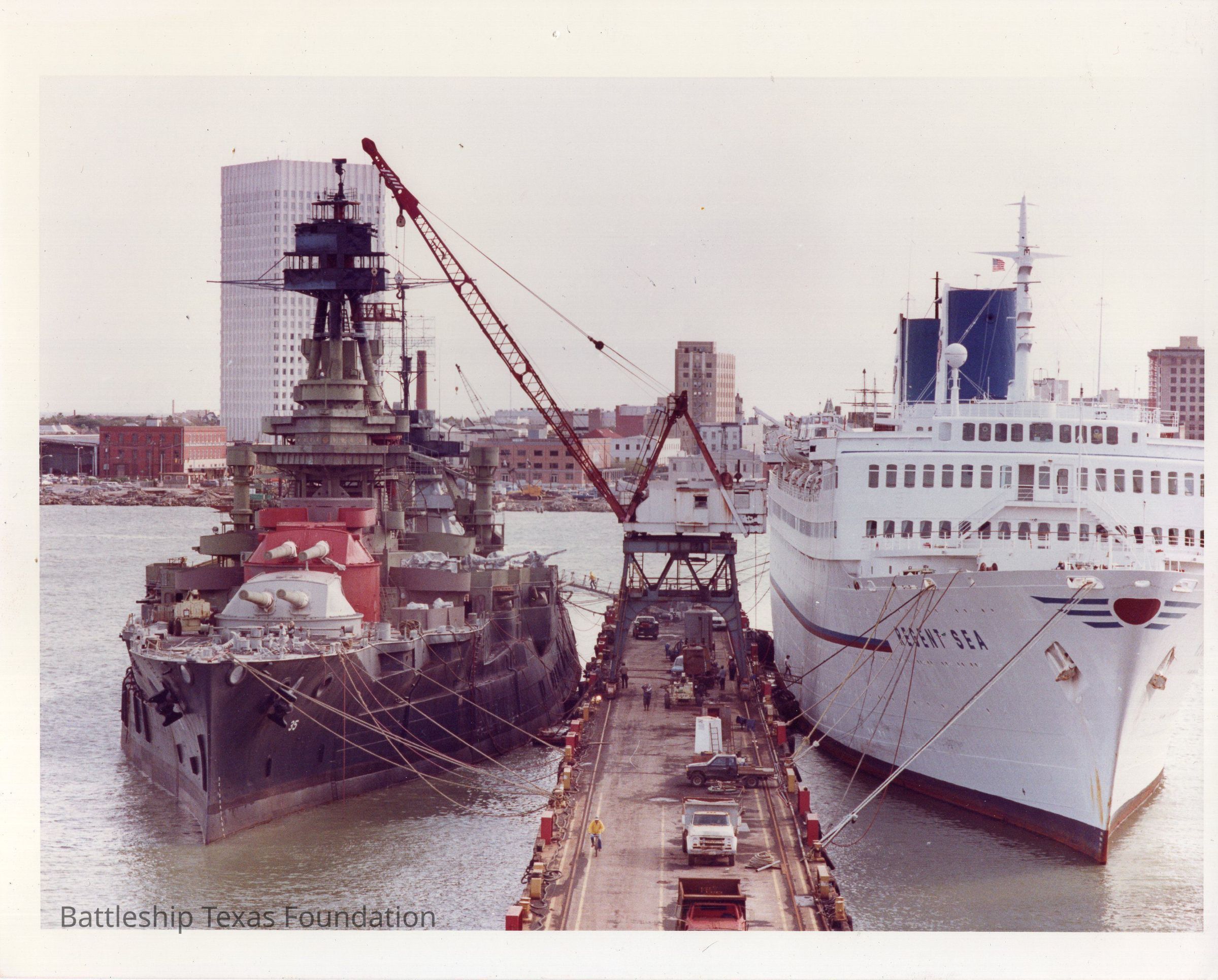 Texas moored on the left with crane over superstructure. Regent Sea moored on the right with a pier between. Galveston strand in background.Context