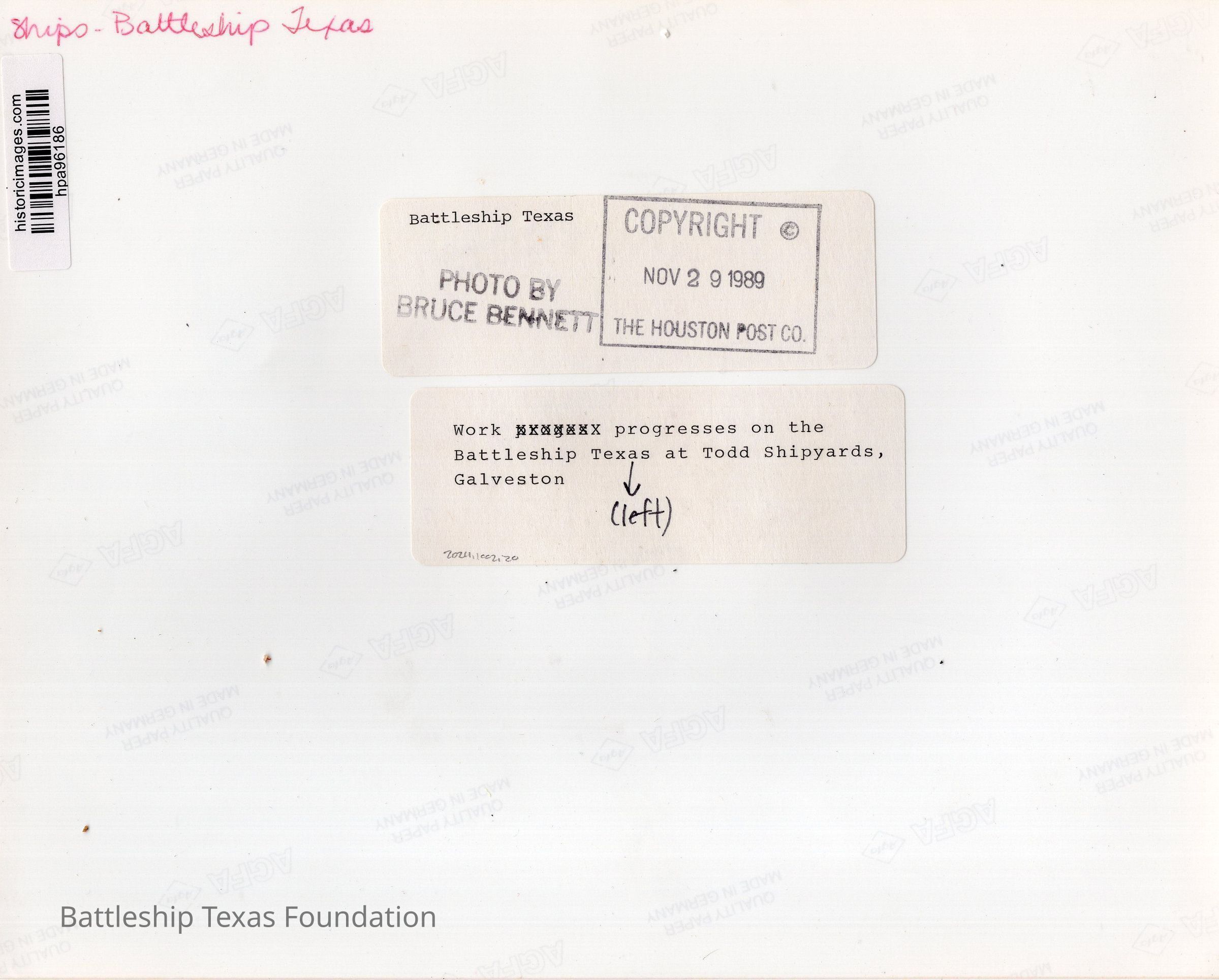 Battleship Texas departed San Jacinto State Park for Todd Shipyard in Galveston where she had hull work in dry dock from December 13, 1988, to August 6, 1989, and then put back in water for additional work through February 23, 1990. She was moved to Green’s Bayou for decking and monopile instillation and returned to San Jacinto Battleground on July 28, 1990. The Battleship Texas Museum was operated by the Texas Parks and Wildlife Department from 1983 to 2020.Collection