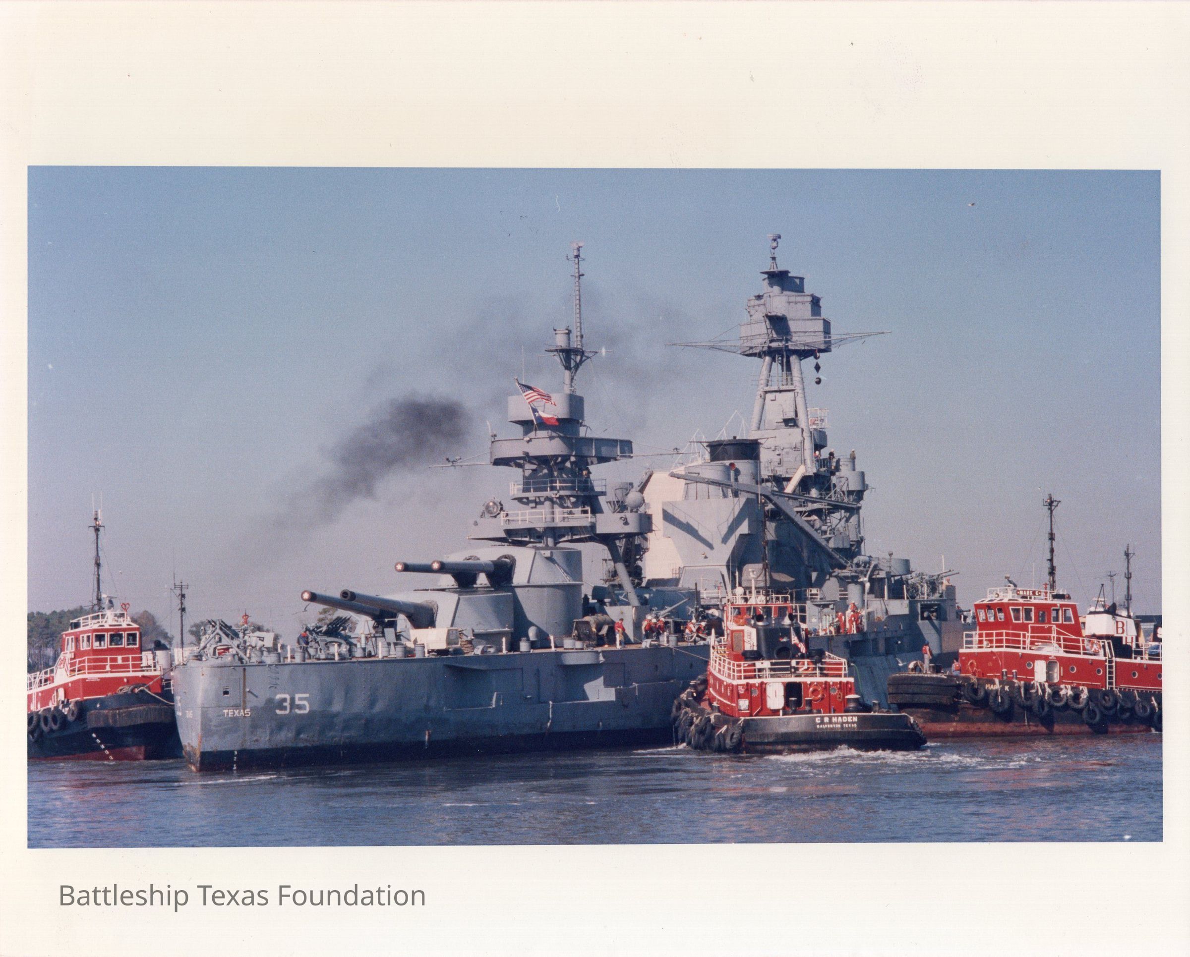 Texas, stern on, pushed by three tugs.Context