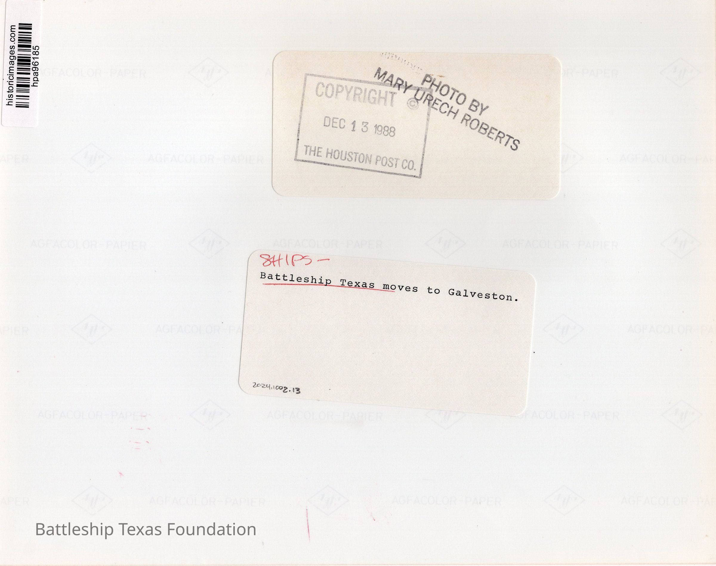 Battleship Texas departed San Jacinto State Park for Todd Shipyard in Galveston where she had hull work in dry dock from December 13, 1988, to August 6, 1989, and then put back in water for additional work through February 23, 1990. She was moved to Green’s Bayou for decking and monopile instillation and returned to San Jacinto Battleground on July 28, 1990. The Battleship Texas Museum was operated by the Texas Parks and Wildlife Department from 1983 to 2020.Collection