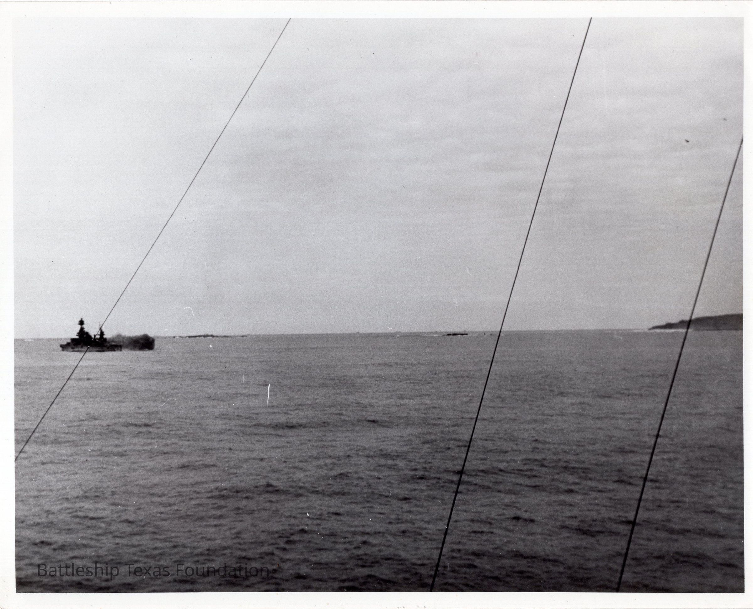Texas firing guns to starboard at shore. Texas in left of photo, shore barely visible on right. Image taken from USS Arkansas.Context