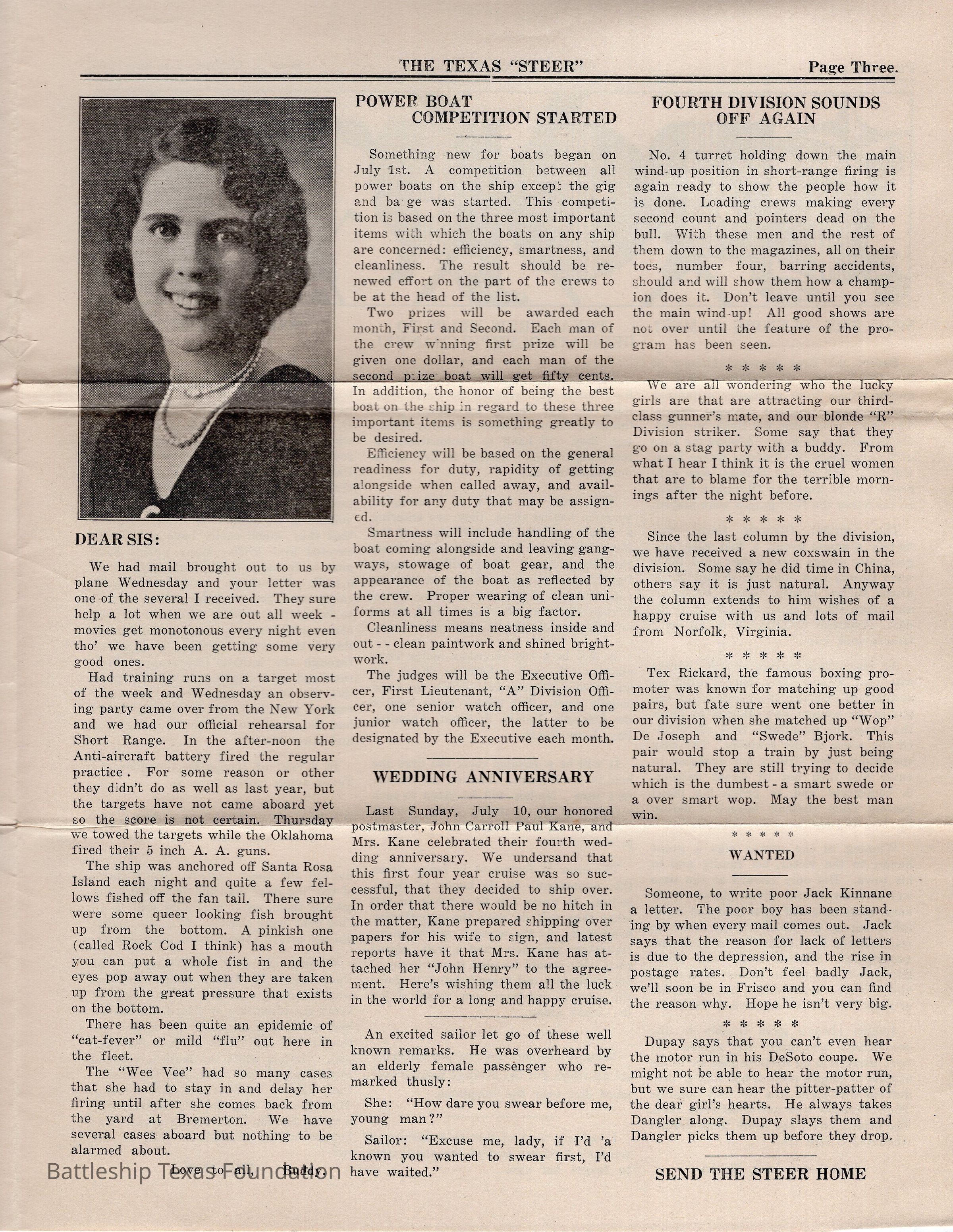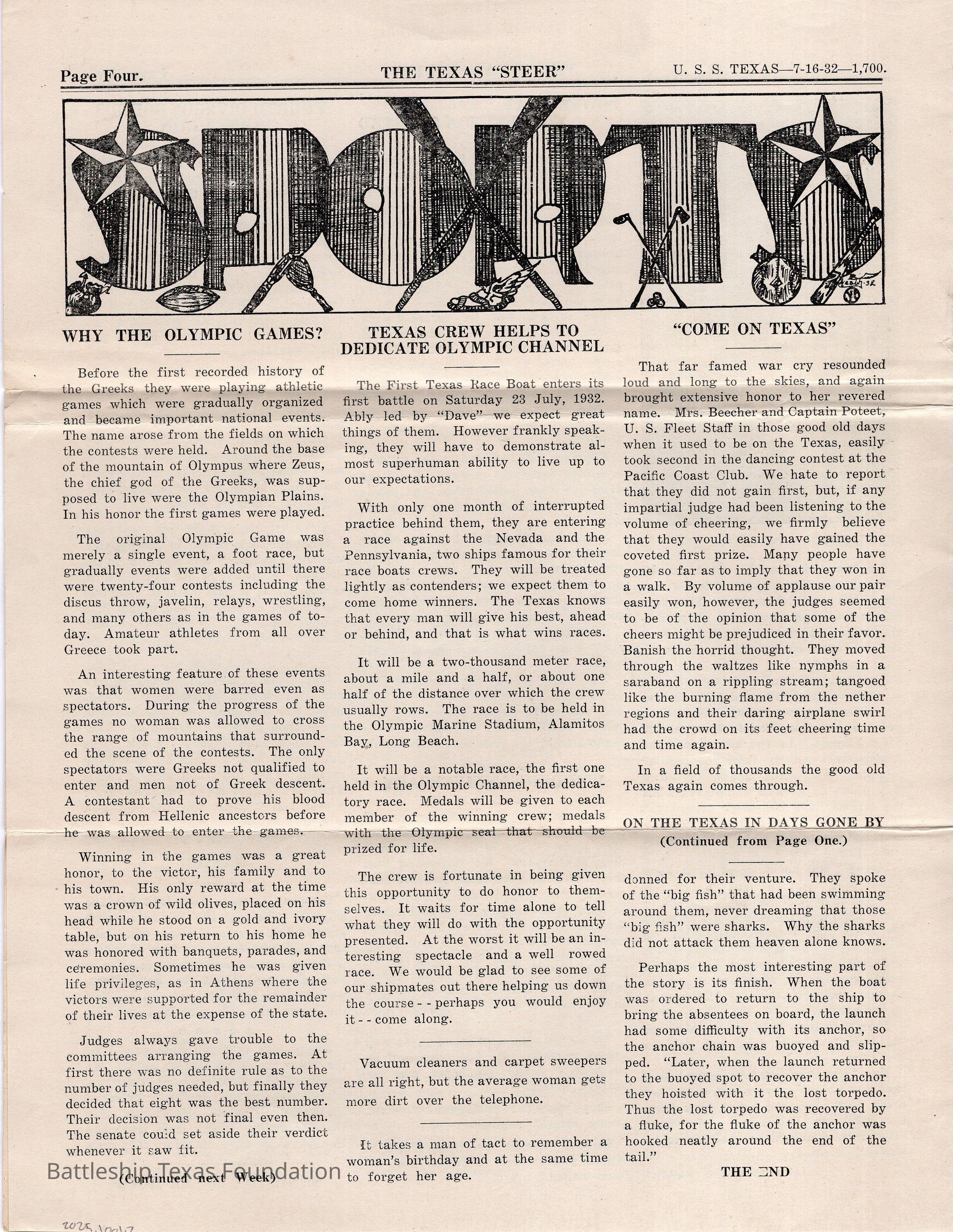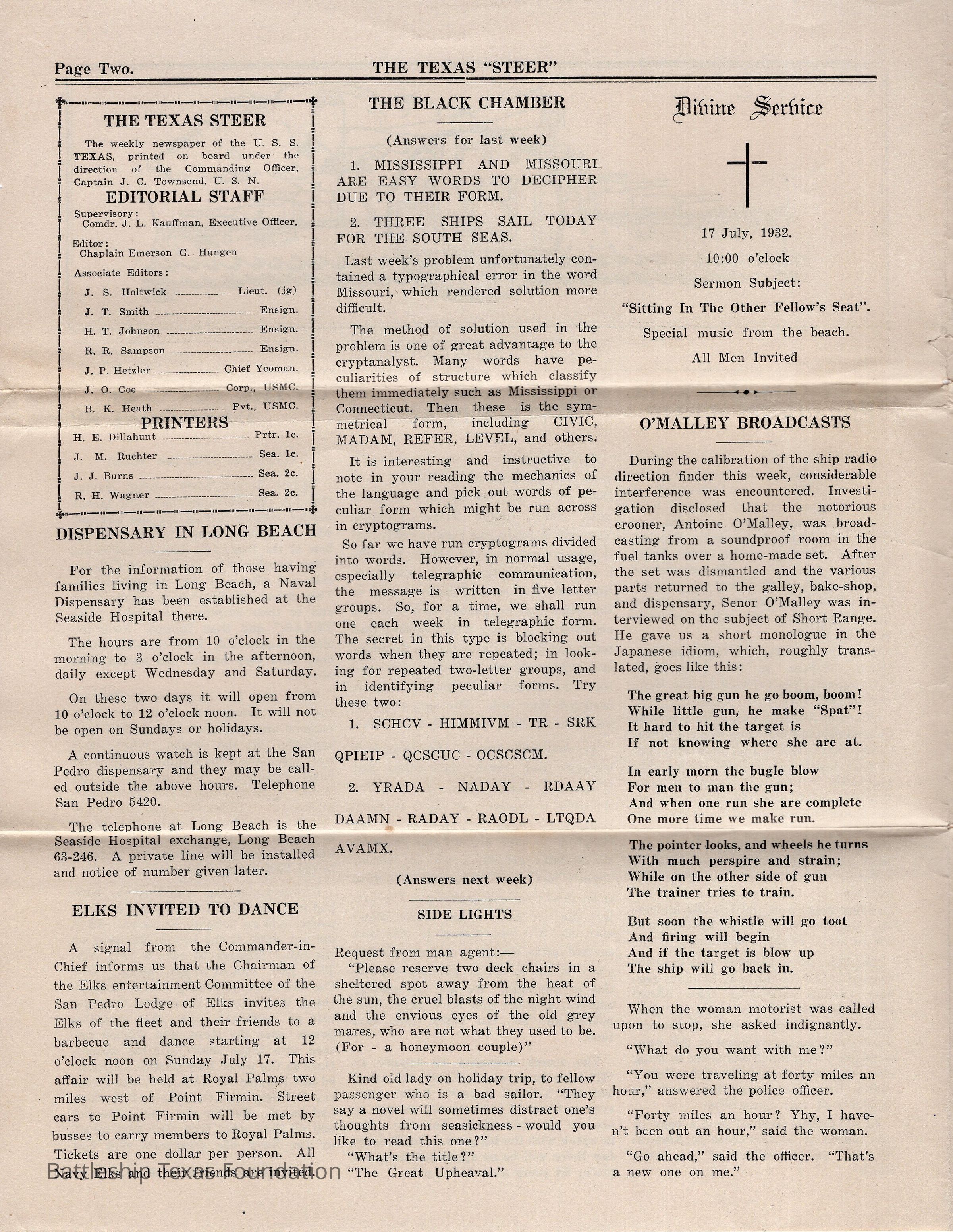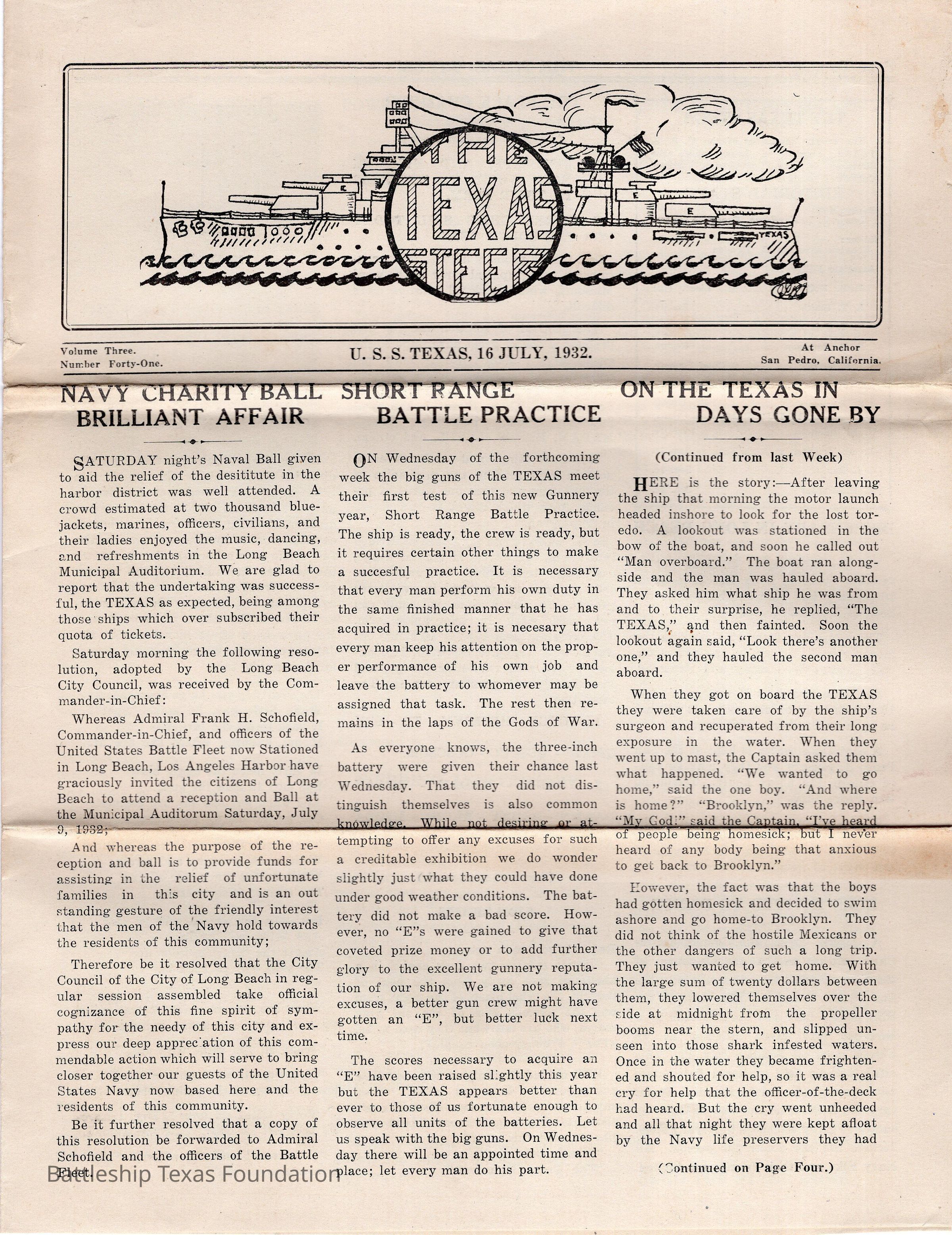 USS Texas published newspaper from 16 July, 1932 while she was at anchor in San Pedro, California.Context
