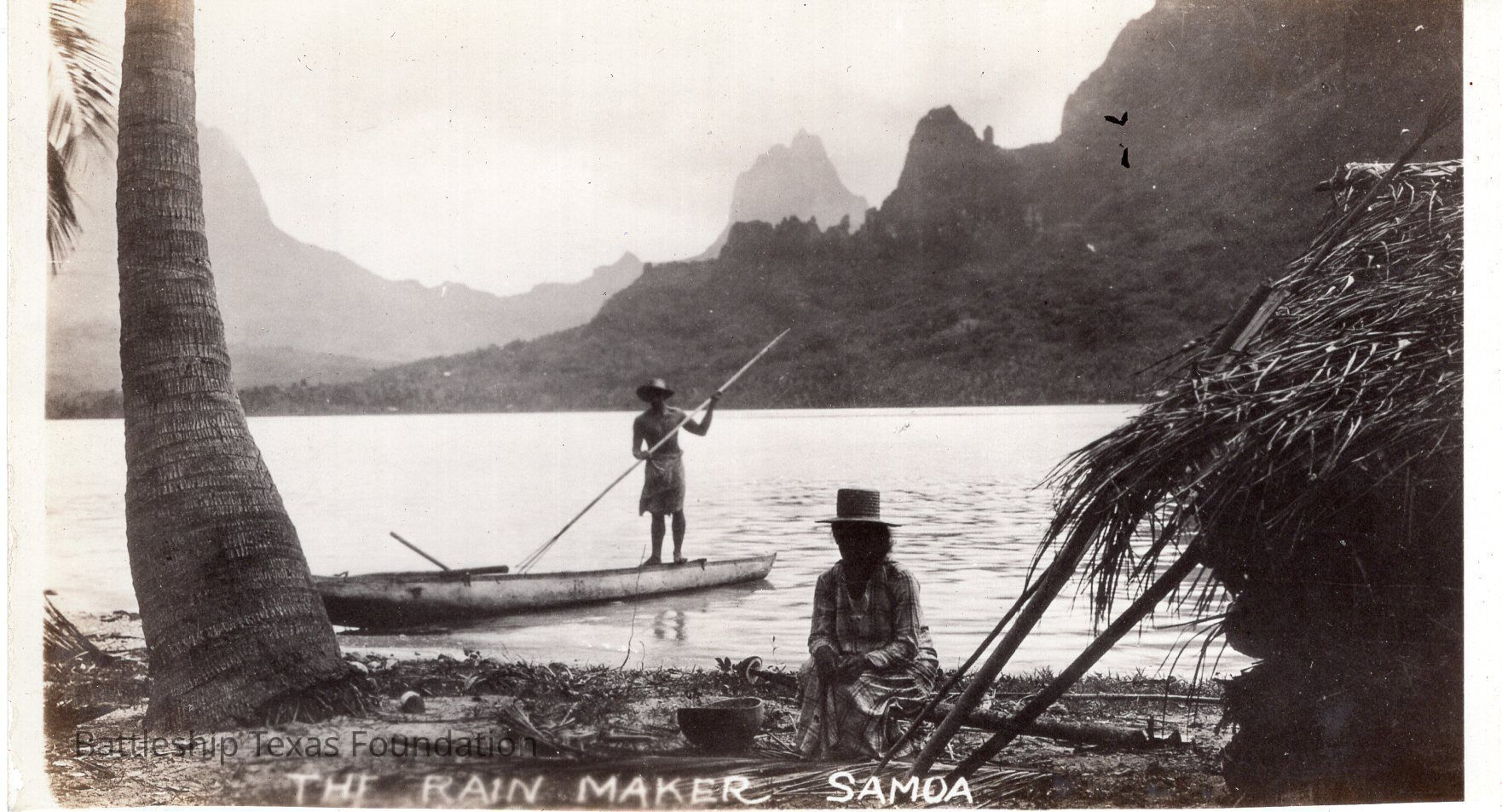 Woman on beach with man in canoe in bay. Mountains in background surrounding bay. Captioned "THE RAIN MAKER SAMOA"Context