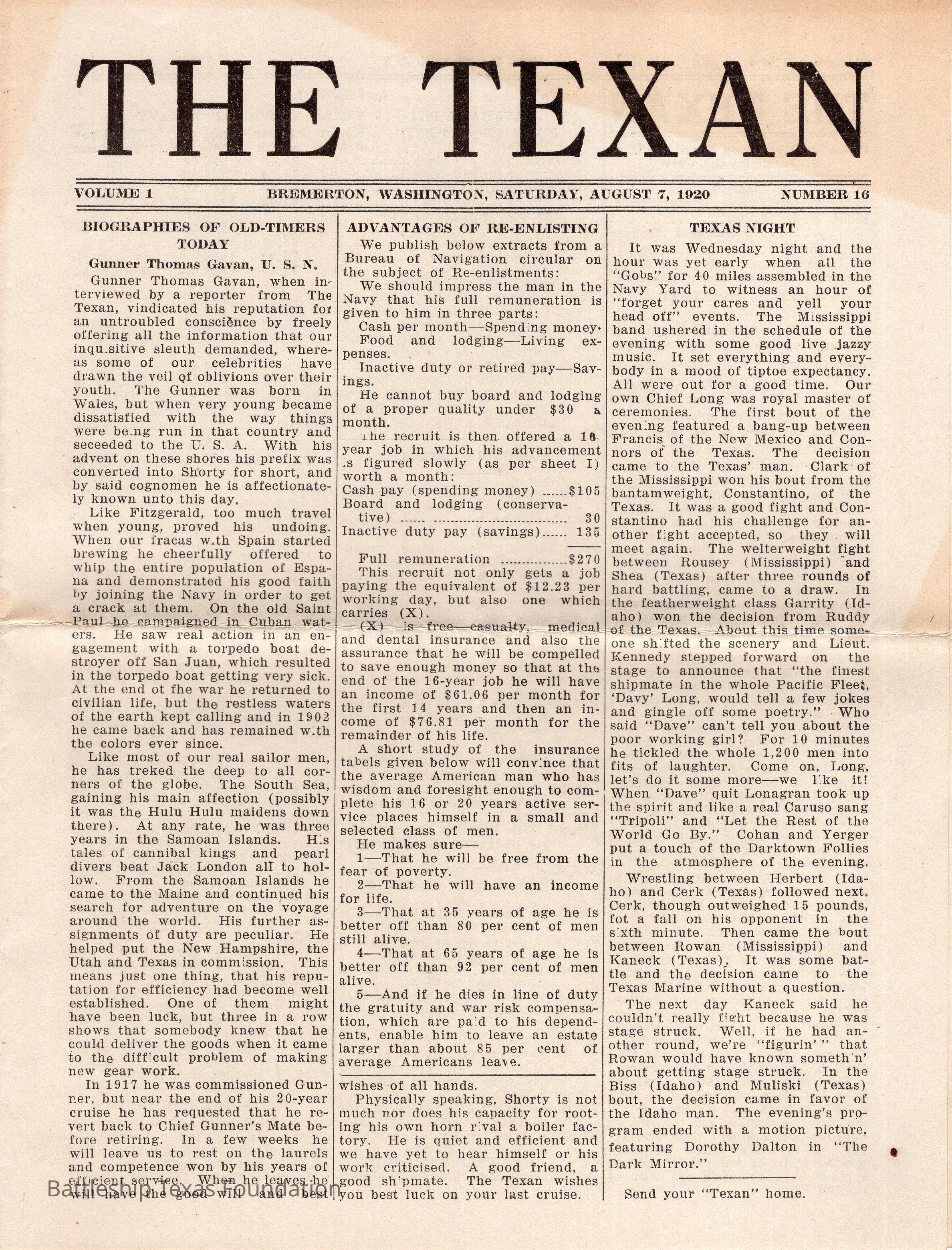 "The Texan" four-page foldout Volume 1 Issue number 16. Published Bremerton, Washington on August 7, 1920.Context