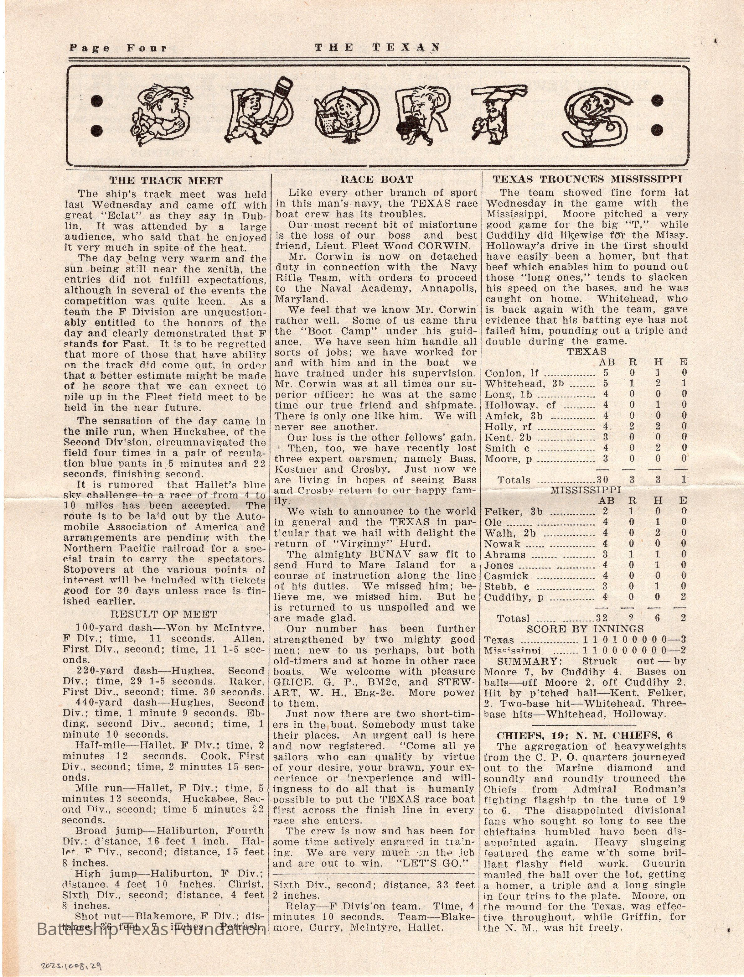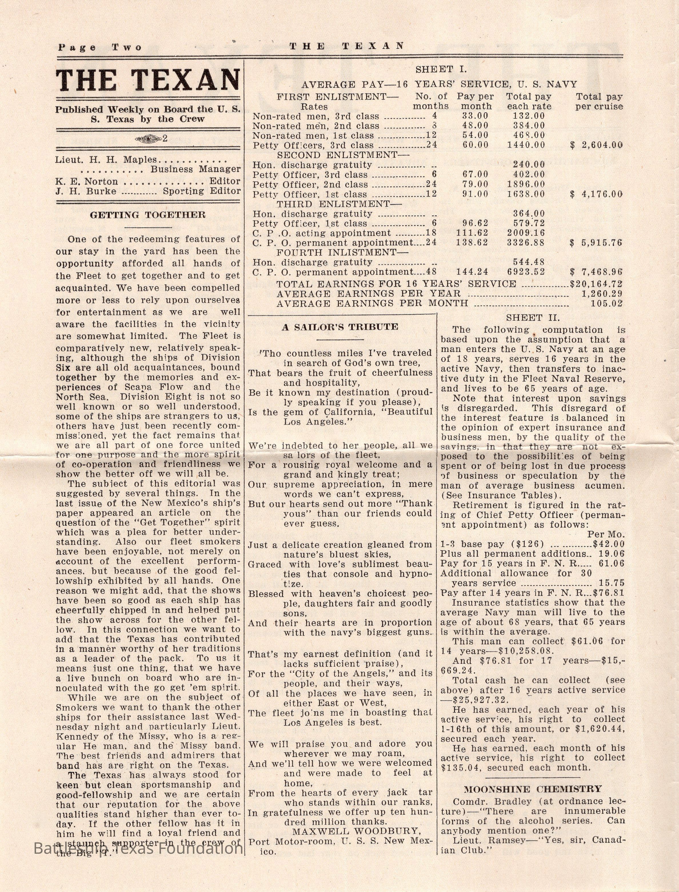 “The Texan” was a weekly newspaper, started in 1920, and published by the crew of Battleship Texas. The paper was published until 1923, running a total of four volumes, with special issues into 1924.Collection