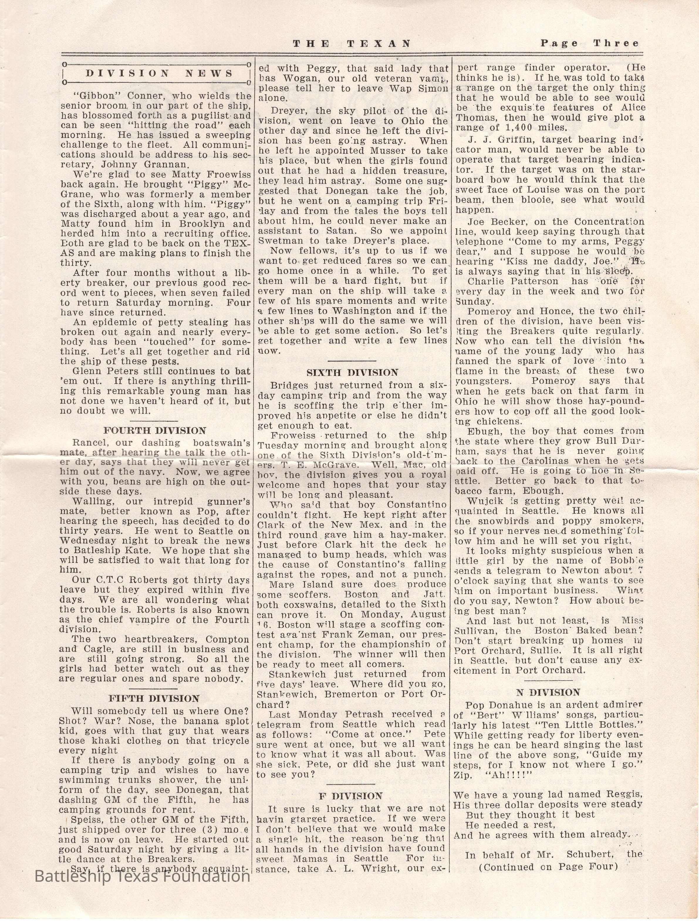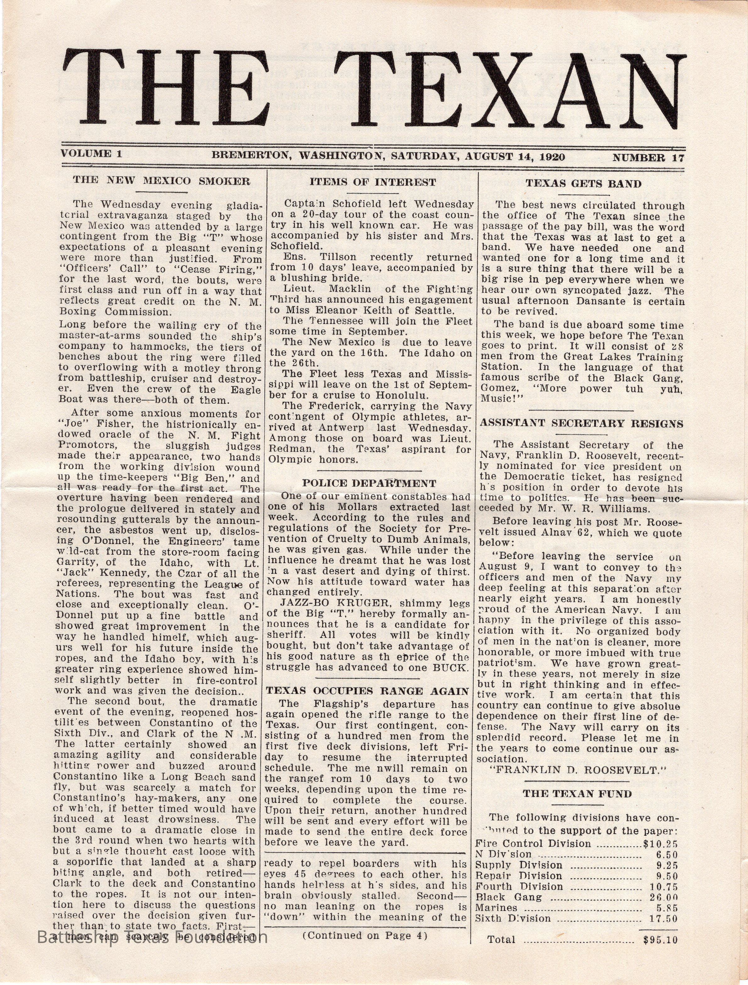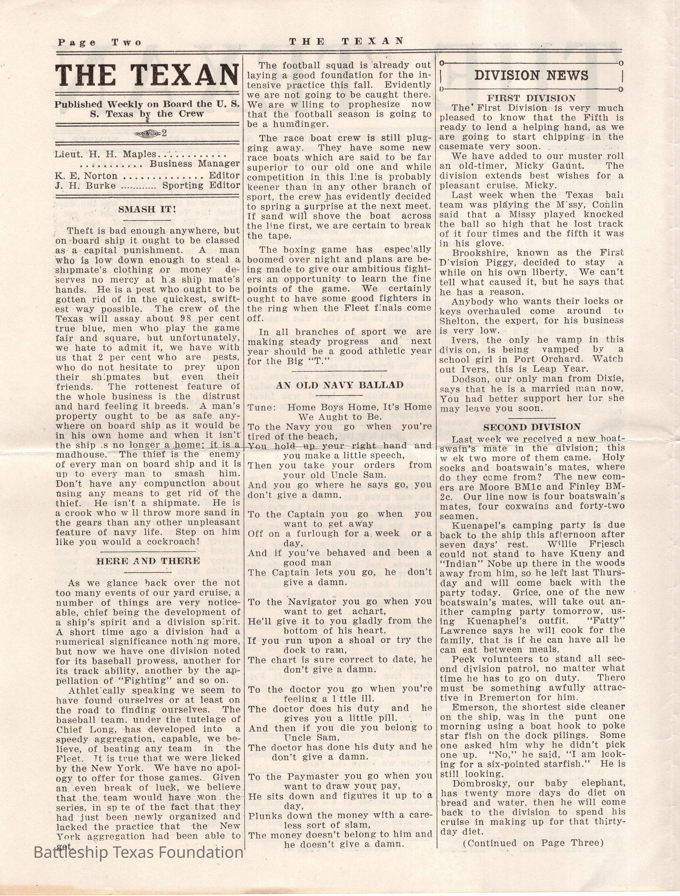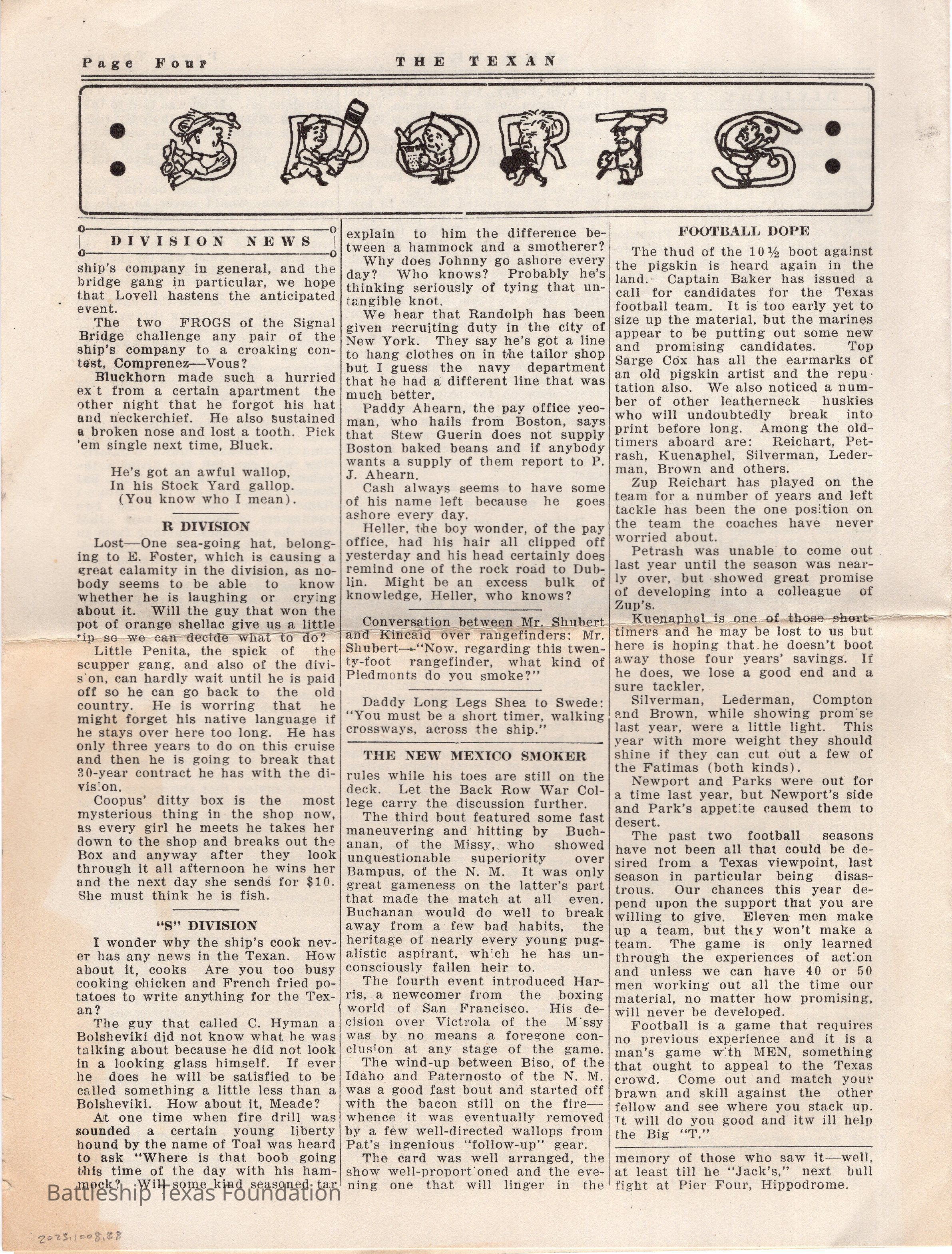“The Texan” was a weekly newspaper, started in 1920, and published by the crew of Battleship Texas. The paper was published until 1923, running a total of four volumes, with special issues into 1924.Collection