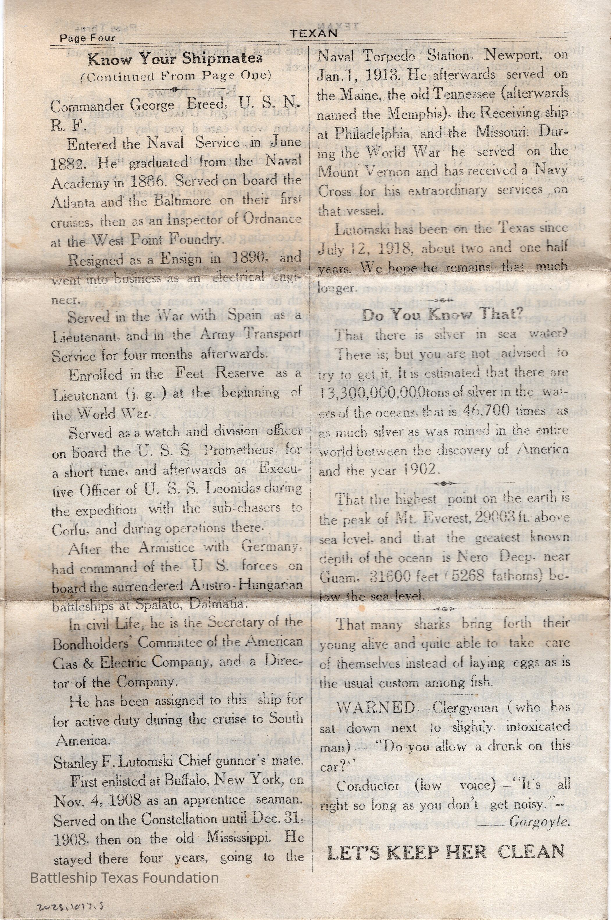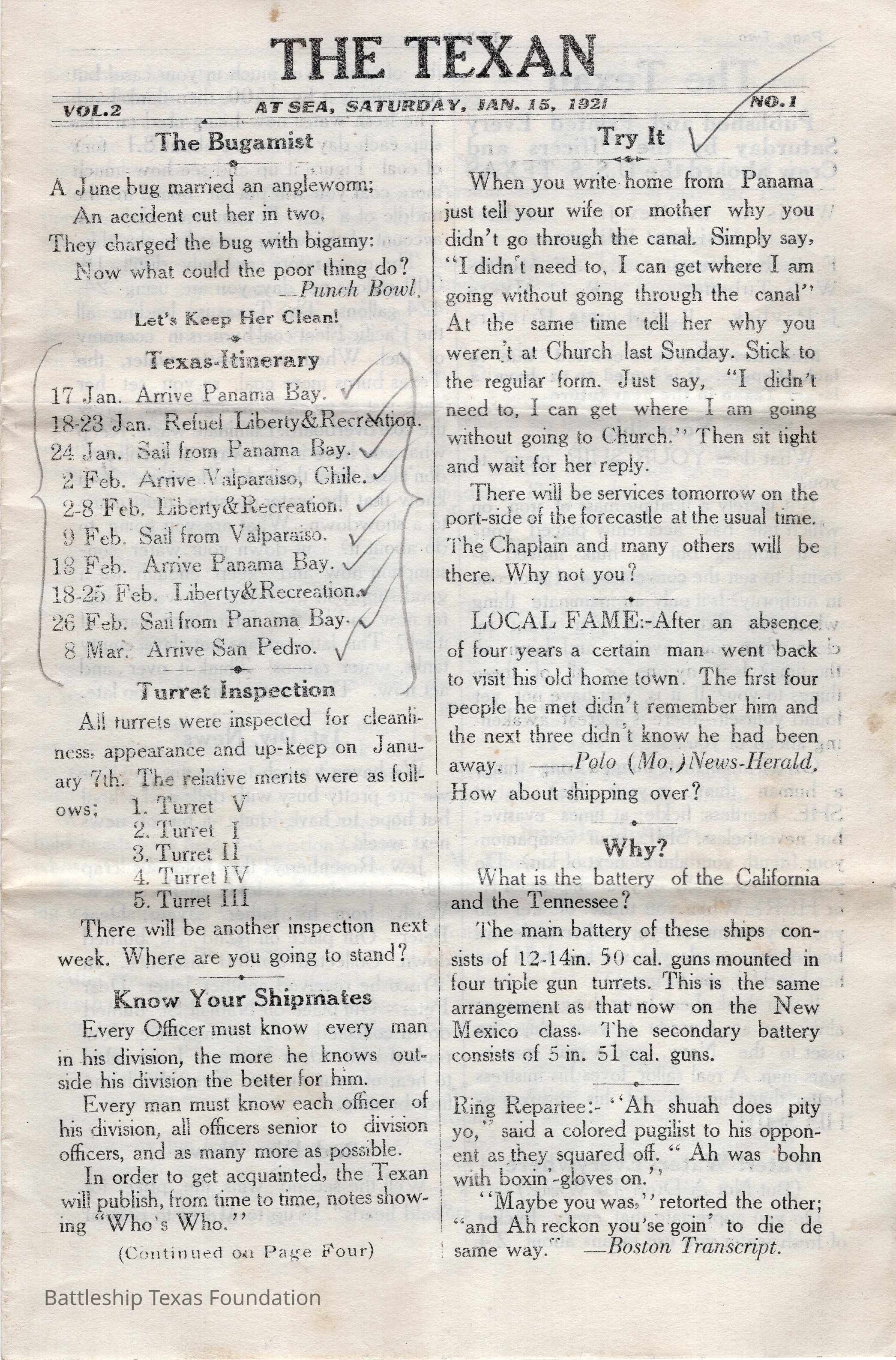 “The Texan” was a weekly newspaper, started in 1920, and published by the crew of Battleship Texas. The paper was published until 1923, running a total of four volumes, with special issues into 1924.Collection