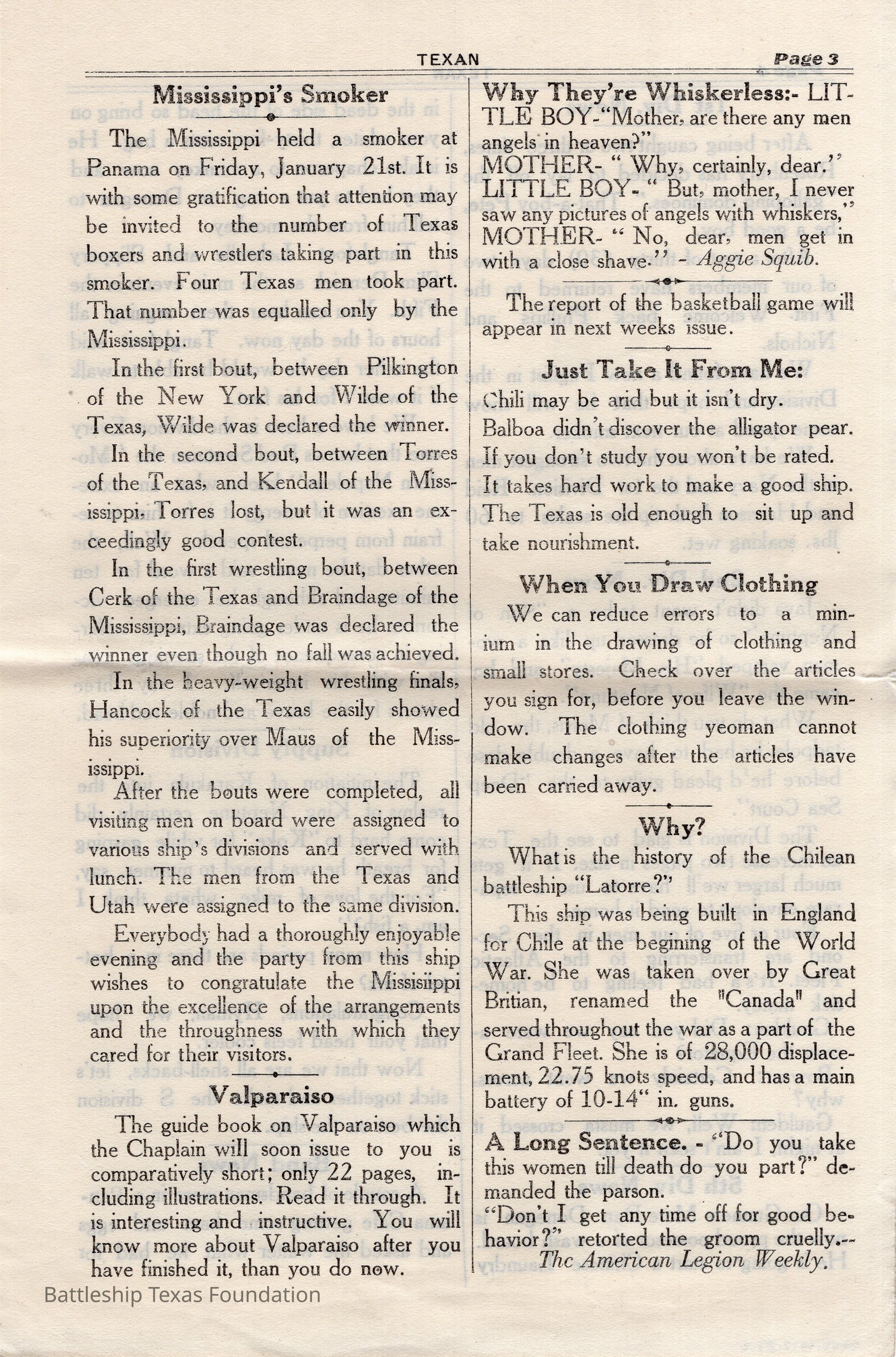 “The Texan” was a weekly newspaper, started in 1920, and published by the crew of Battleship Texas. The paper was published until 1923, running a total of four volumes, with special issues into 1924.Collection