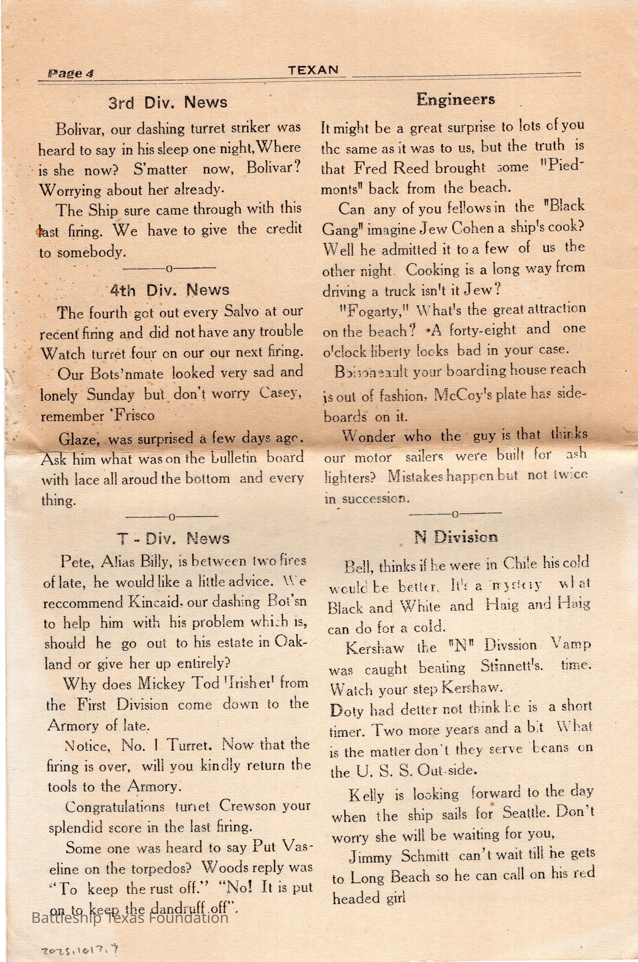 “The Texan” was a weekly newspaper, started in 1920, and published by the crew of Battleship Texas. The paper was published until 1923, running a total of four volumes, with special issues into 1924.Collection