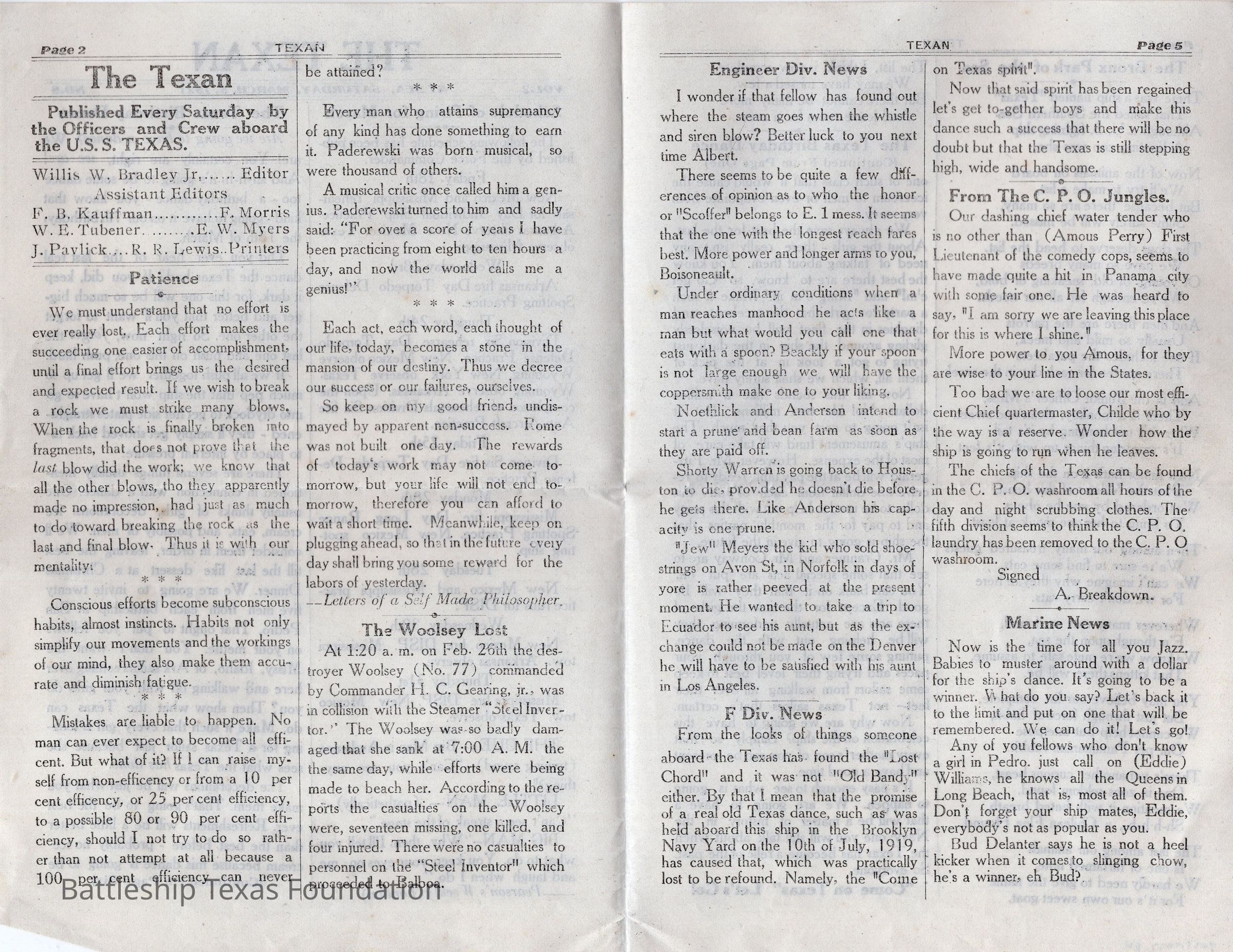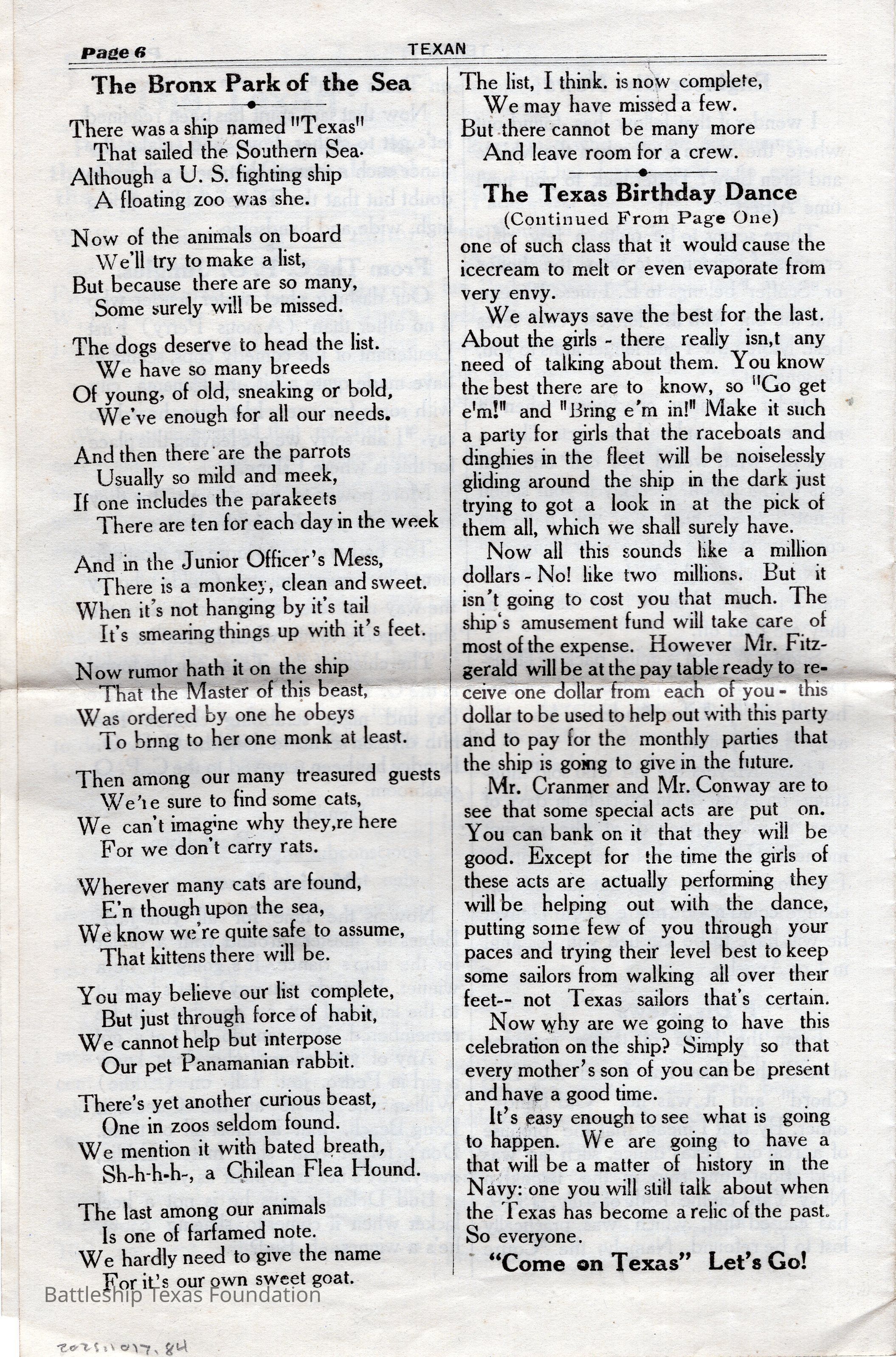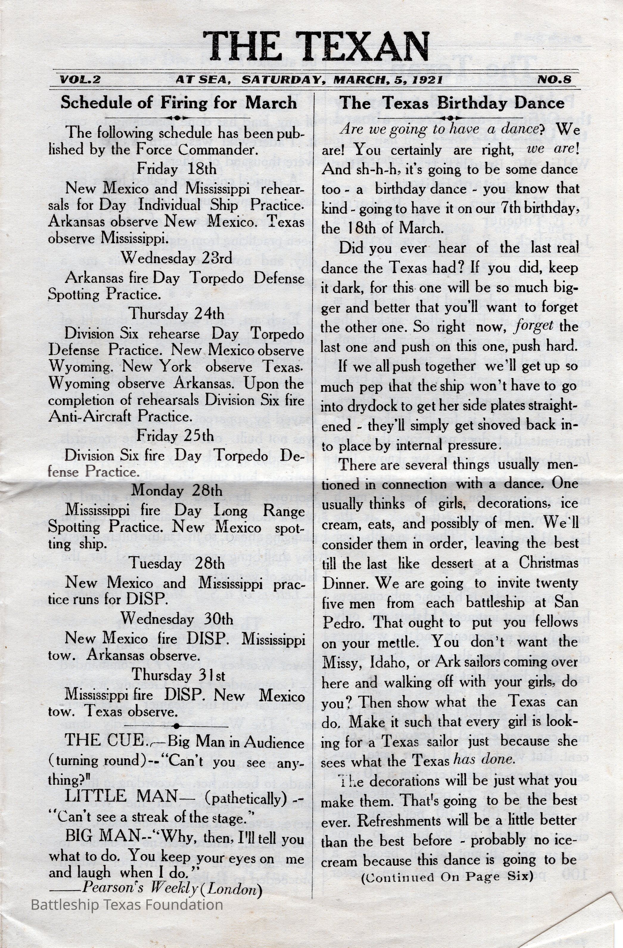 “The Texan” was a weekly newspaper, started in 1920, and published by the crew of Battleship Texas. The paper was published until 1923, running a total of four volumes, with special issues into 1924.Collection