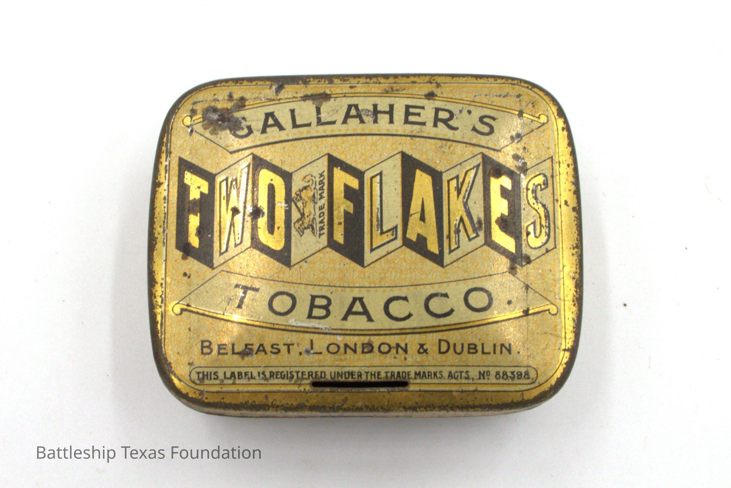 Yellow color. Cover says "Gallaher's Two Flakes Tobacco"Context