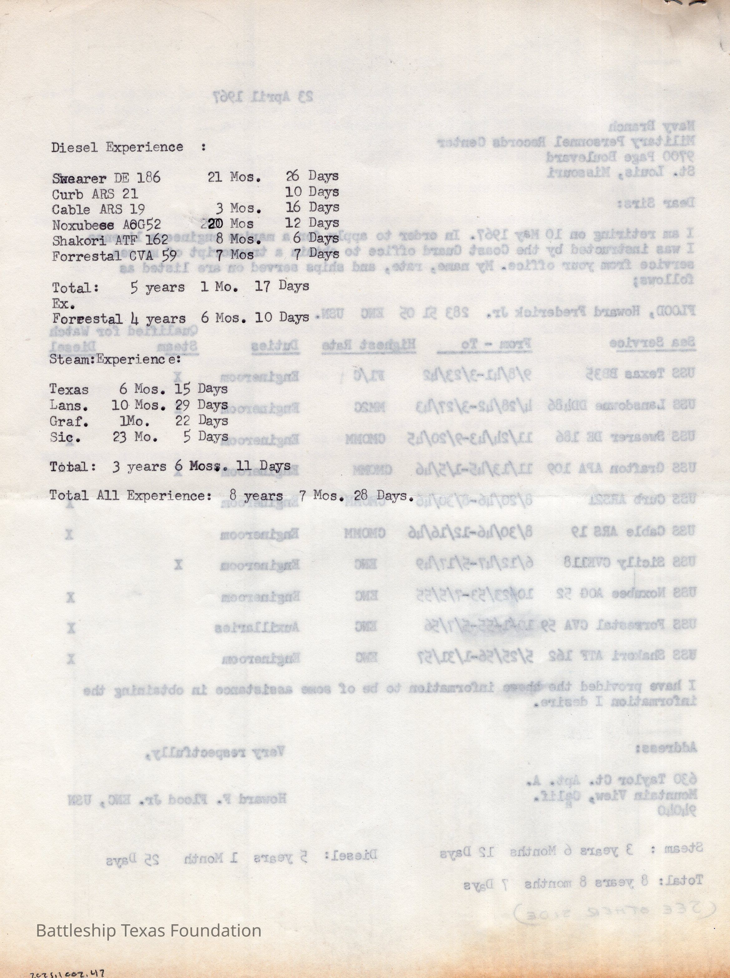 Packet of forms related to Howard Flood's USN sea service transcript. Form is meant to help sailors translate their military service to the civilian workforce. Flood's mentions the years of work in various engine rooms of US warships. USS Texas listed as steam engine experience.Context