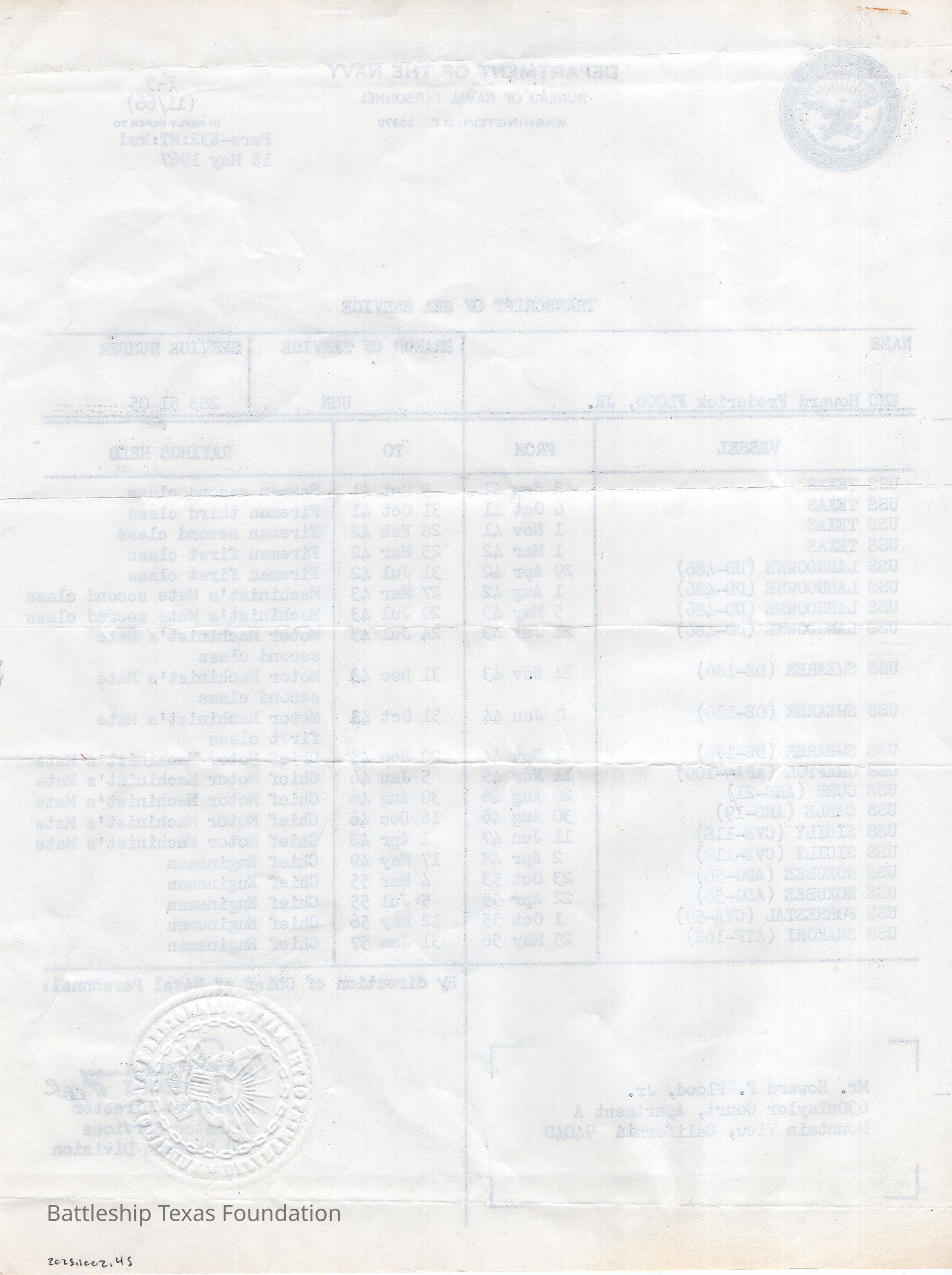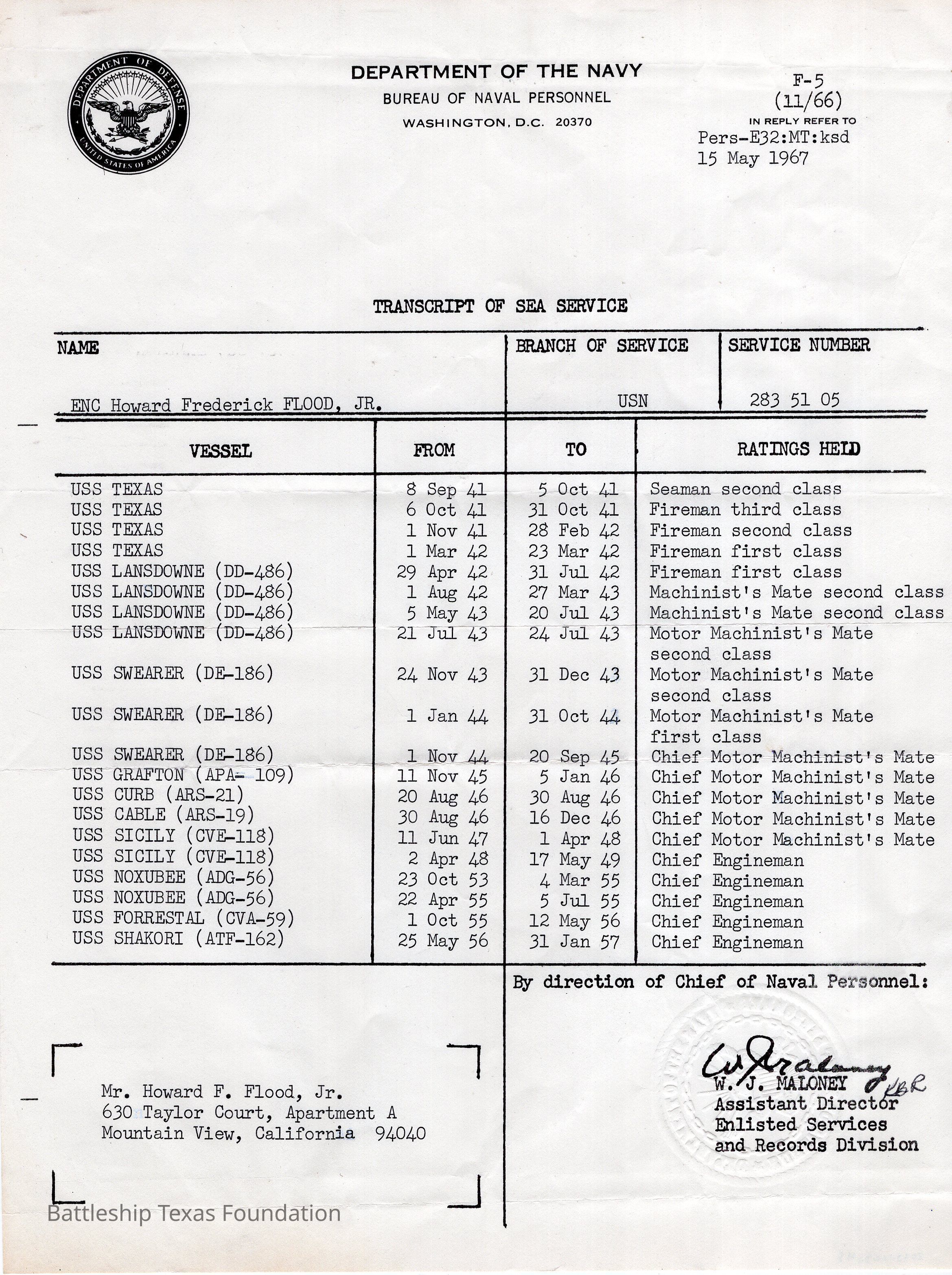 Howard Flood's Transcript of Sea Service from May 15, 1967. Service aboard USS Texas shown from September 8, 1941, to March 23, 1942. Other ships he served on through January 31, 1957, listed below.Context