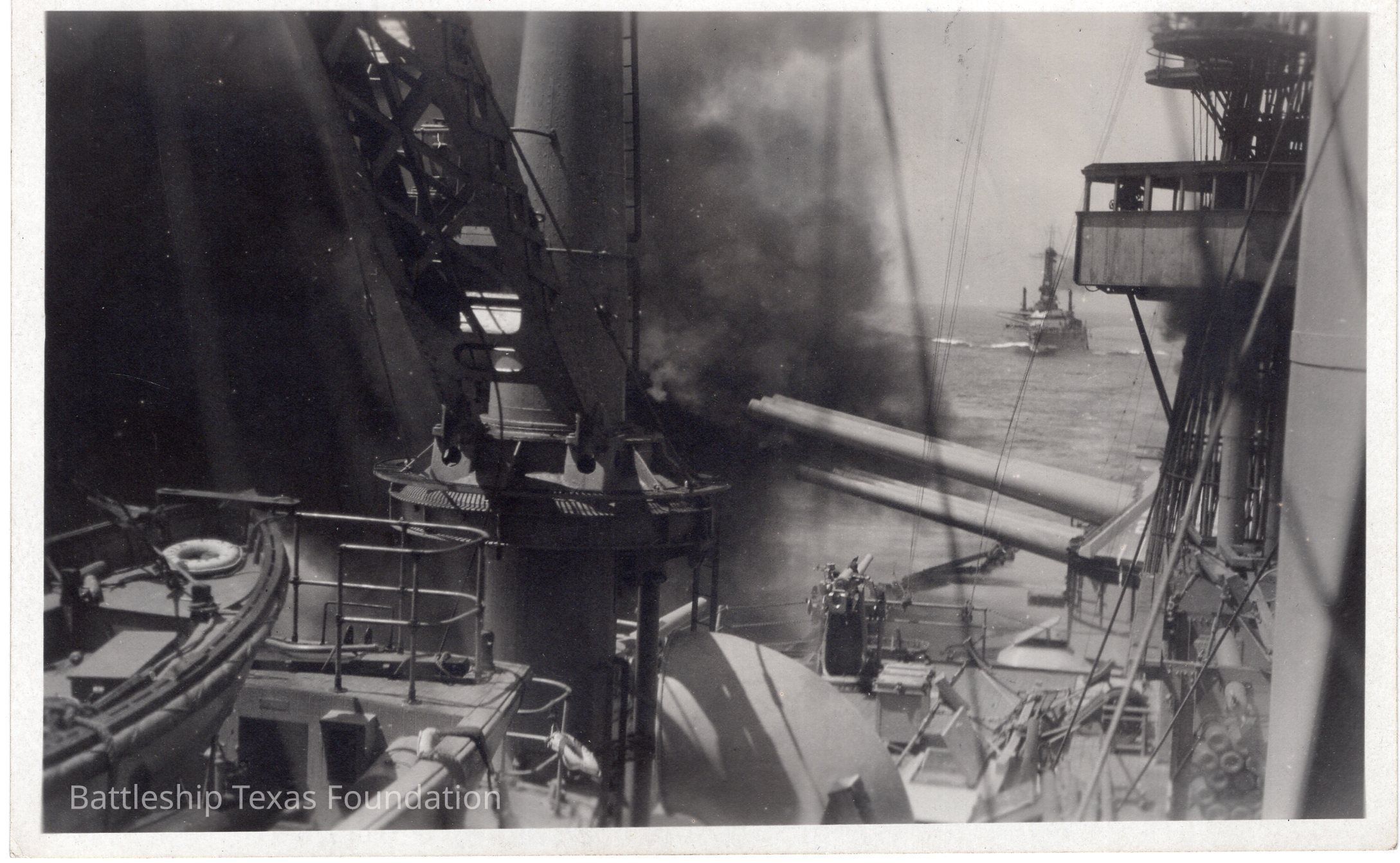 Two three-gun turrets firing with another battleship in distance also firing.Context
