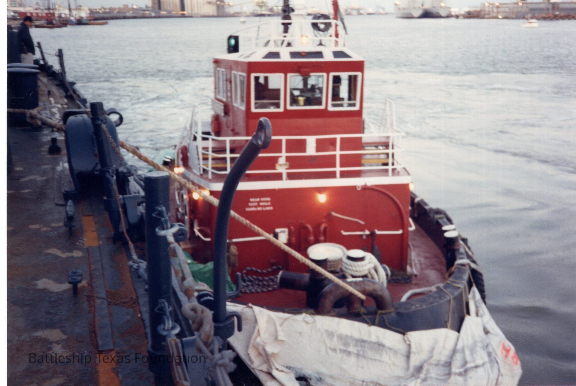 Tugboat moored along portside of Texas as she is moved from Todd Shipyard to Greens Bayou. Galveston Ship Chanel in background.