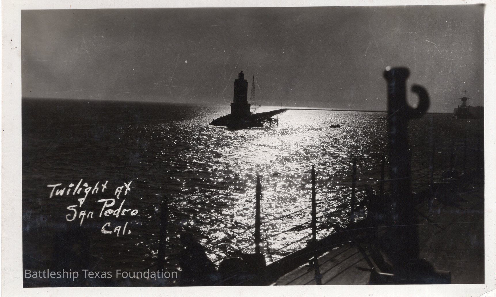 Lighthouse off side of ship. Battleship in far background. Captioned "Twilight at San Pedro Cal."Context