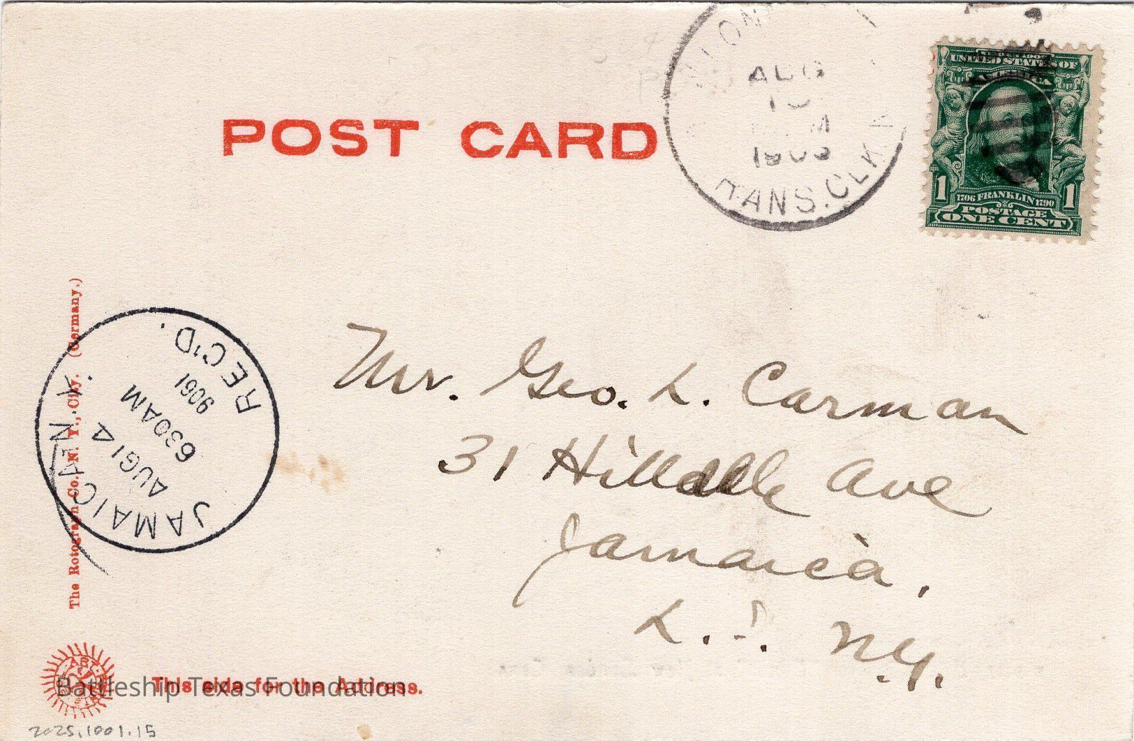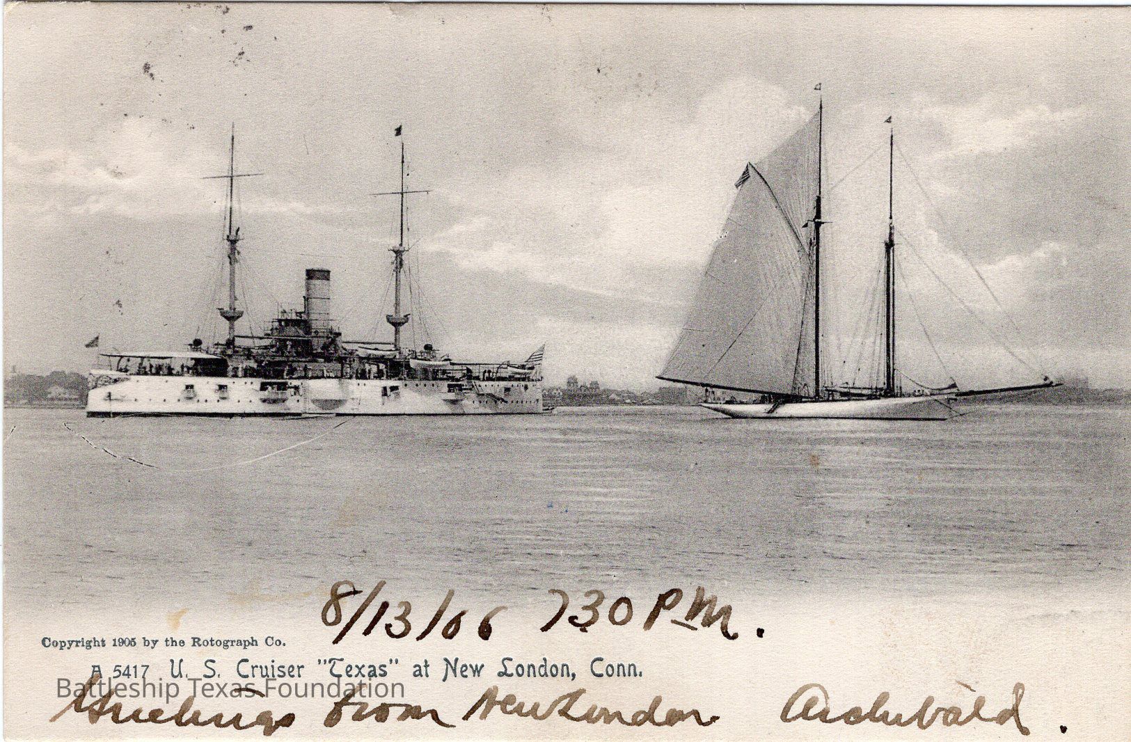 1906 postcard of the 1895 Battleship Texas next to a sailing ship. Caption referes to Texas as a cruiser. Postcard printed in 1906 and written on August 13, 1906 at 7:30 PM, but stamped for August 4 at 6:30PM on the back. Addressed to Mr. Carman.Context