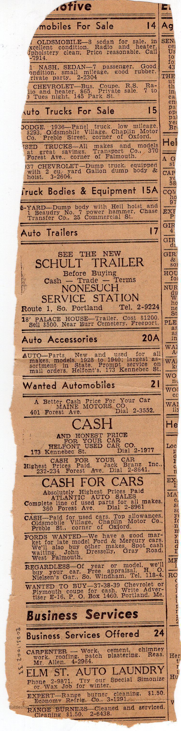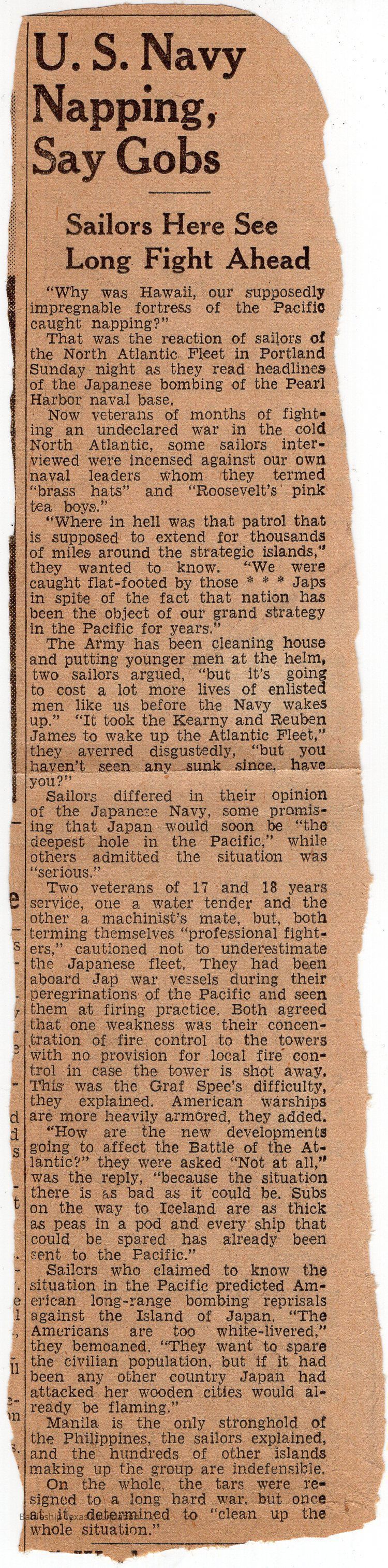 Newspaper clipping titled "U.S. Navy Napping, Says Gobs: Sailors Here See Long Fight Ahead" and printed in the aftermath of the attack on Pearl Harbor. The back of the clipping has advertisements.Context