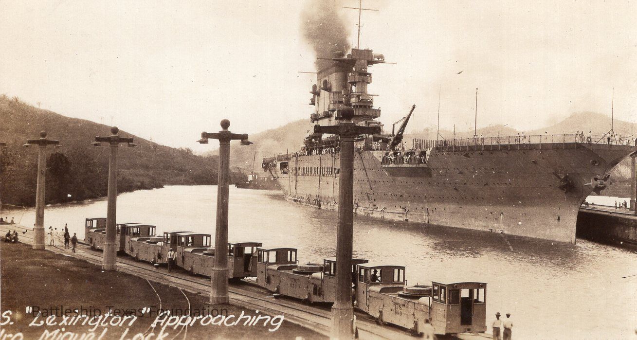 USS Lexington in Panama Canal approaching one of the locks. Photo cut from larger original, part of caption missing.Context