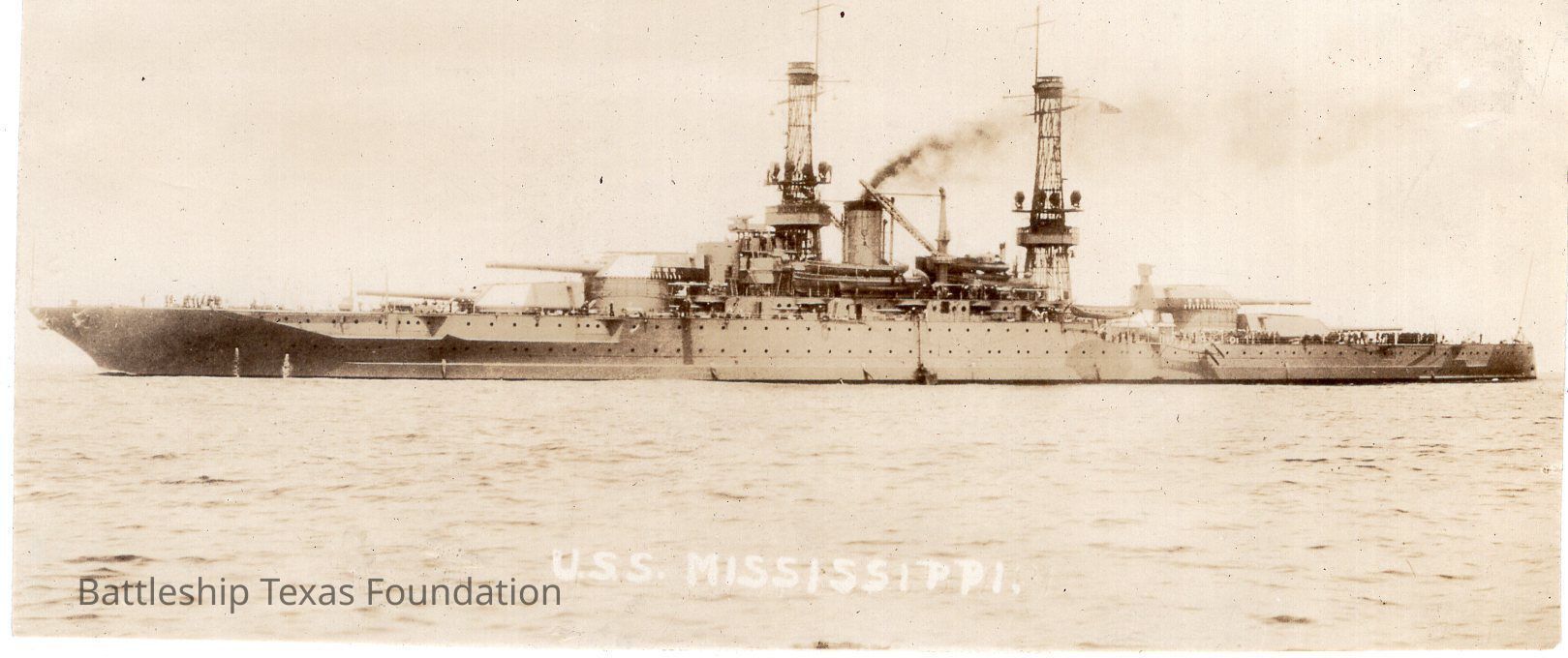 Photo shows USS Mississippi (BB-41) positioned facing the left of the photograph. Captioned "U.S.S. MISSISSIPPI"Context