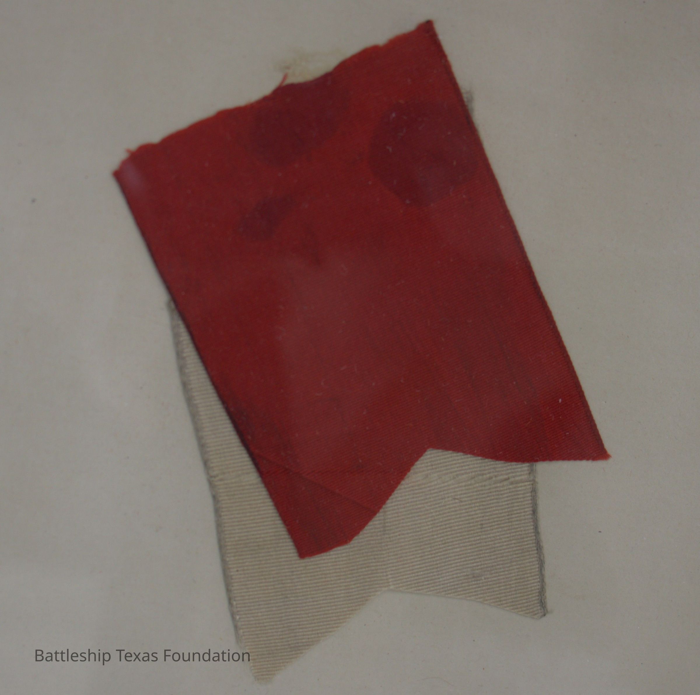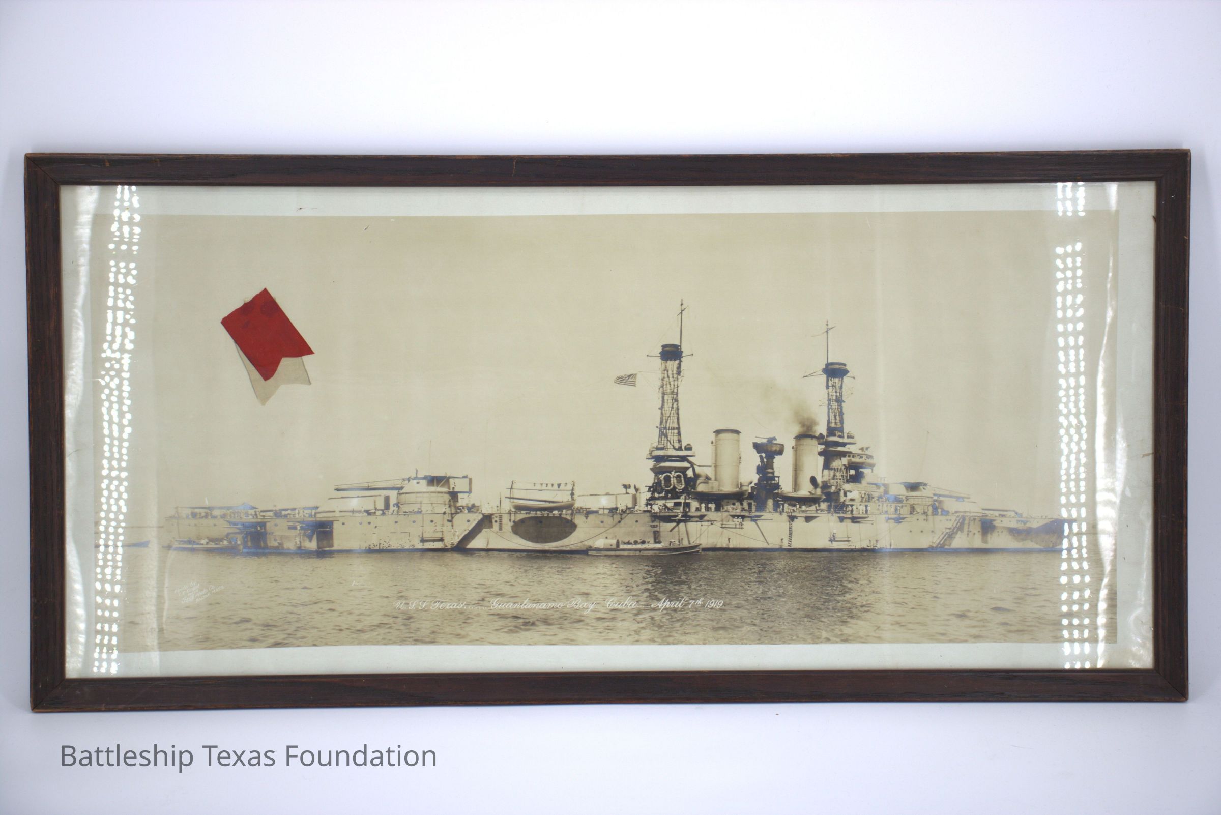 Large framed photograph of the starboard side of Battleship Texas. Red and White ribbon in the top left side of the frame. Captioned:
