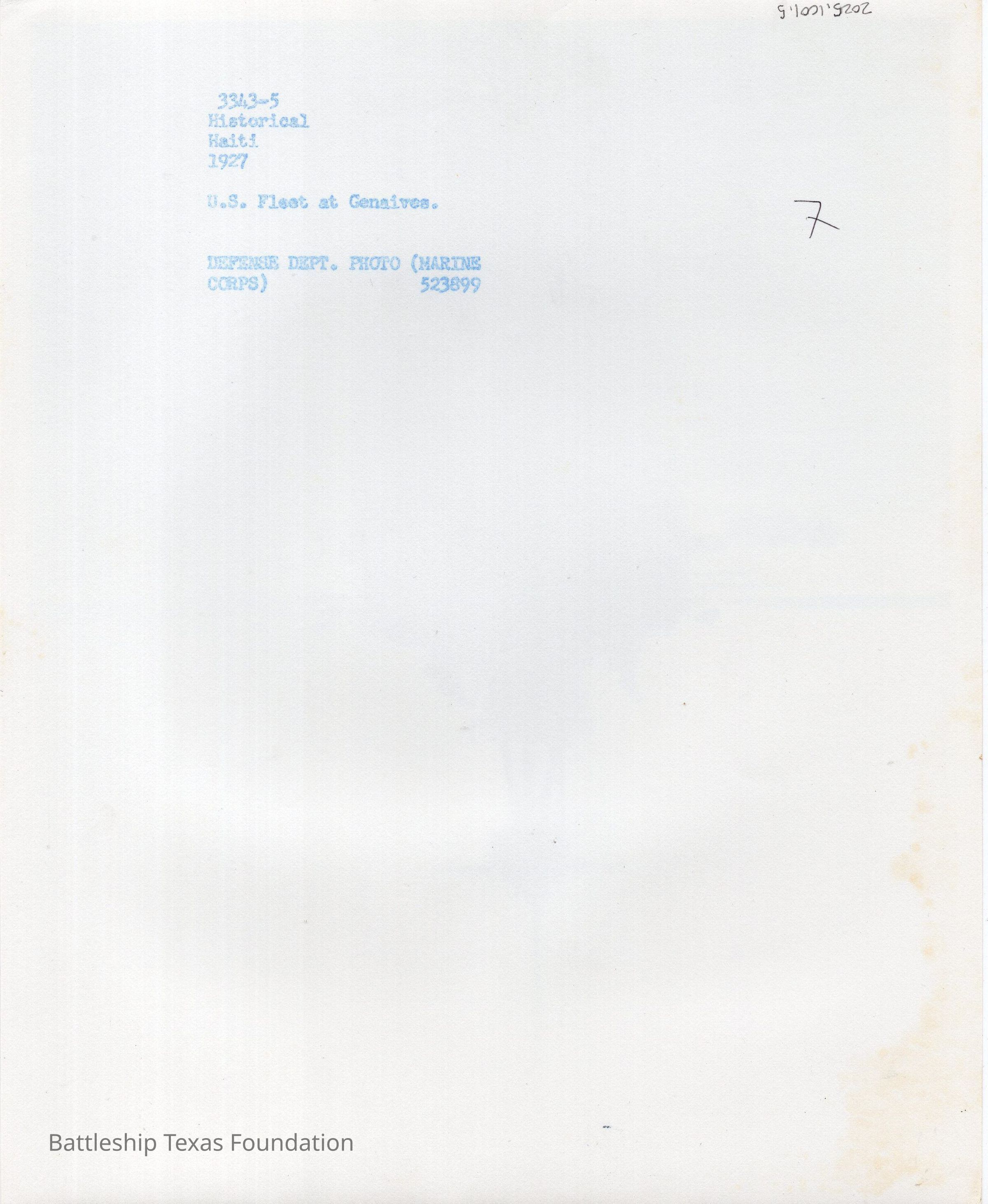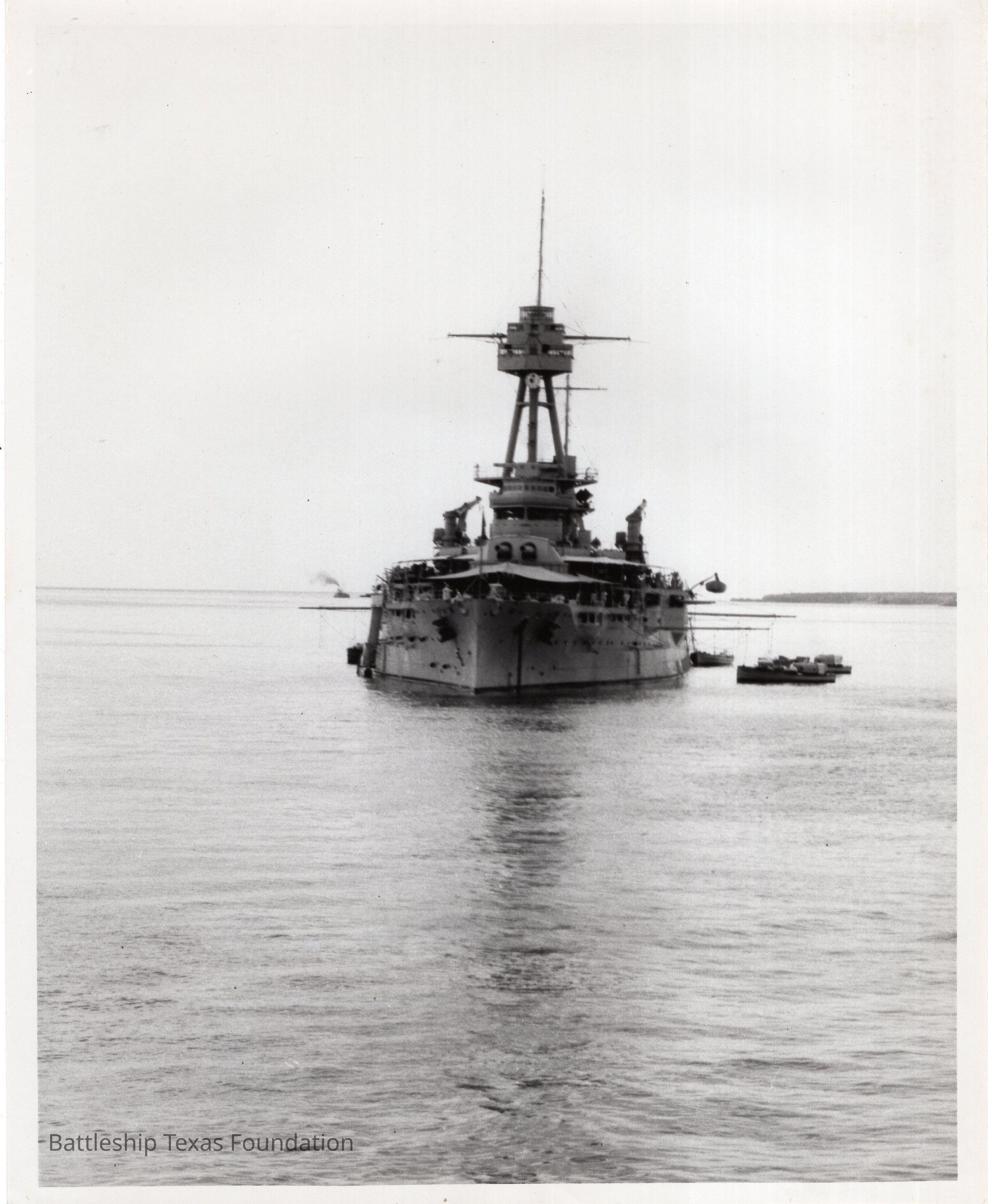 Texas with canvas covering the bow, pushes off two utility boats while another pulls up to the side of the ship. Other craft in background. Back has the caption