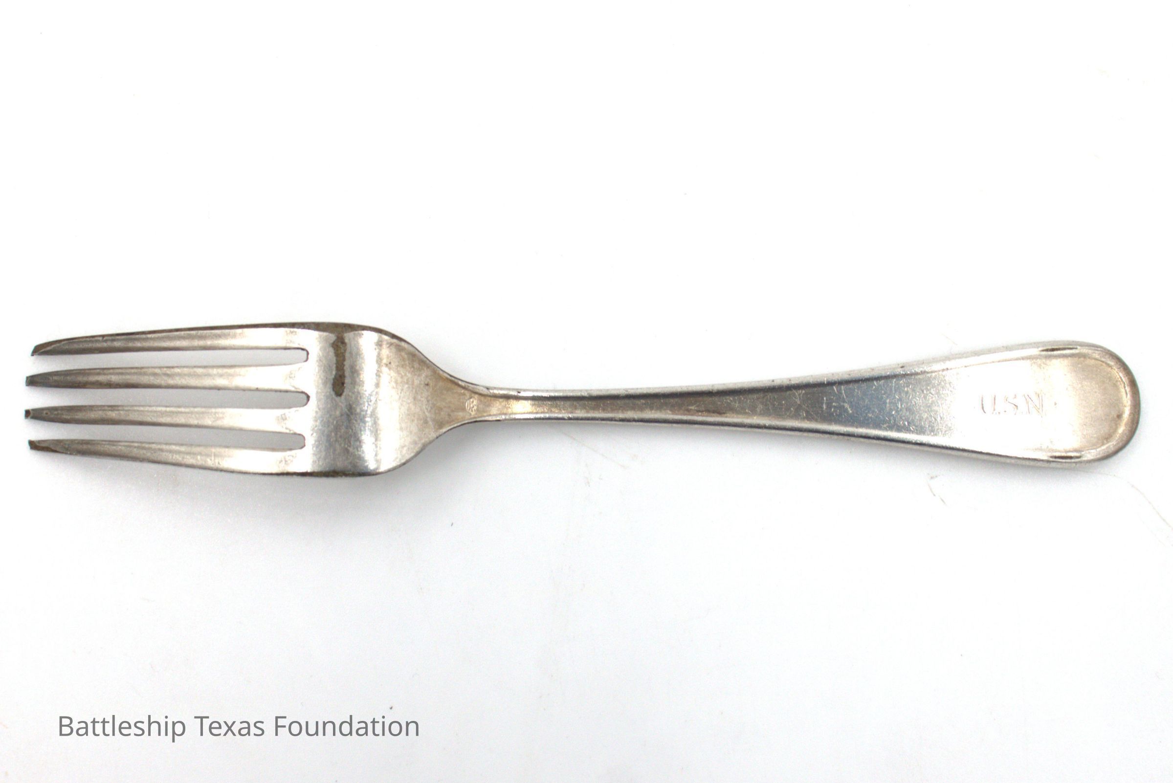 Simple fork with "USN" on base of handle on the back. Weathering of the silver on back of prongs.