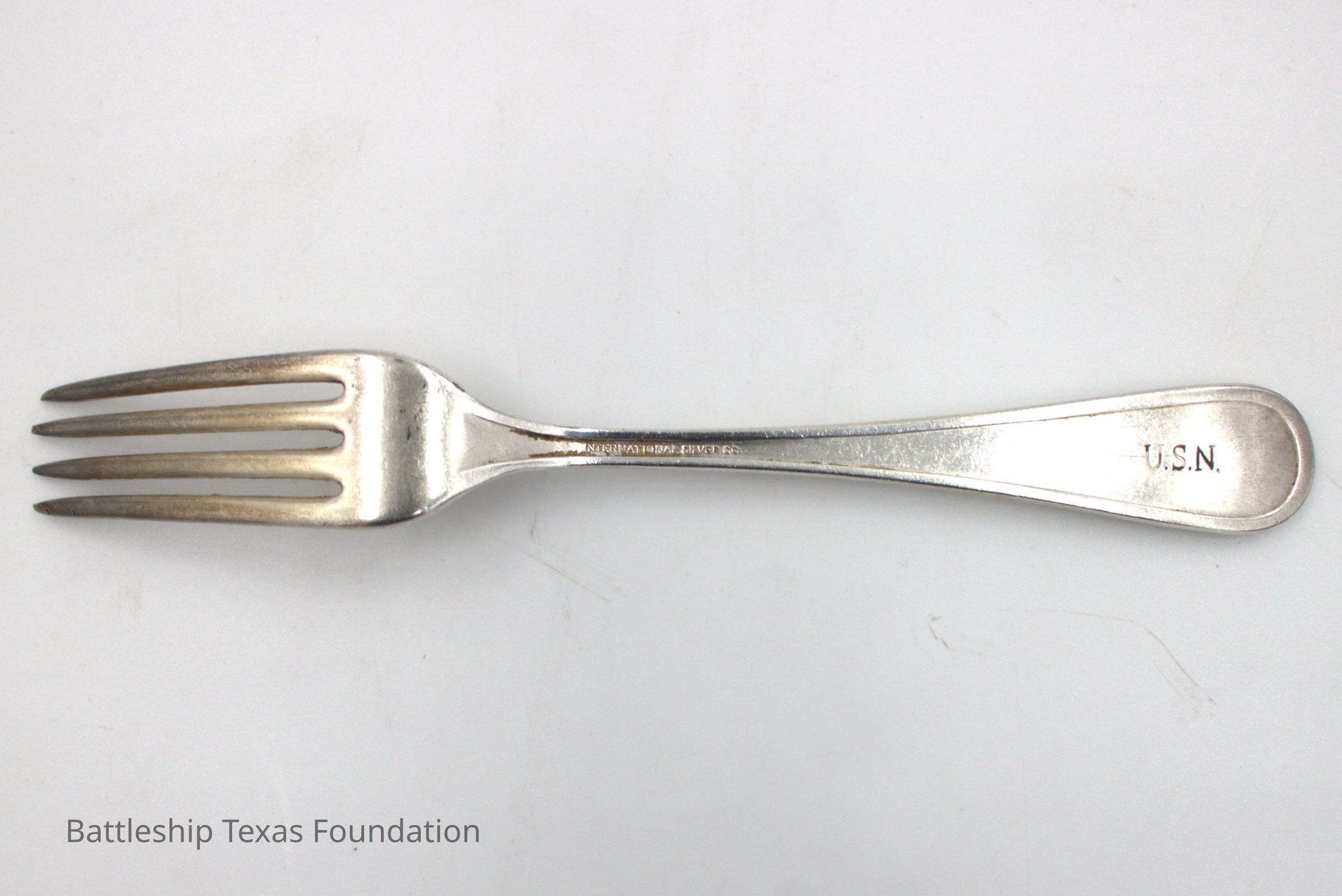Simple fork with "USN" on base of handle on the back. Weathering of the silver on back of prongs and handle.