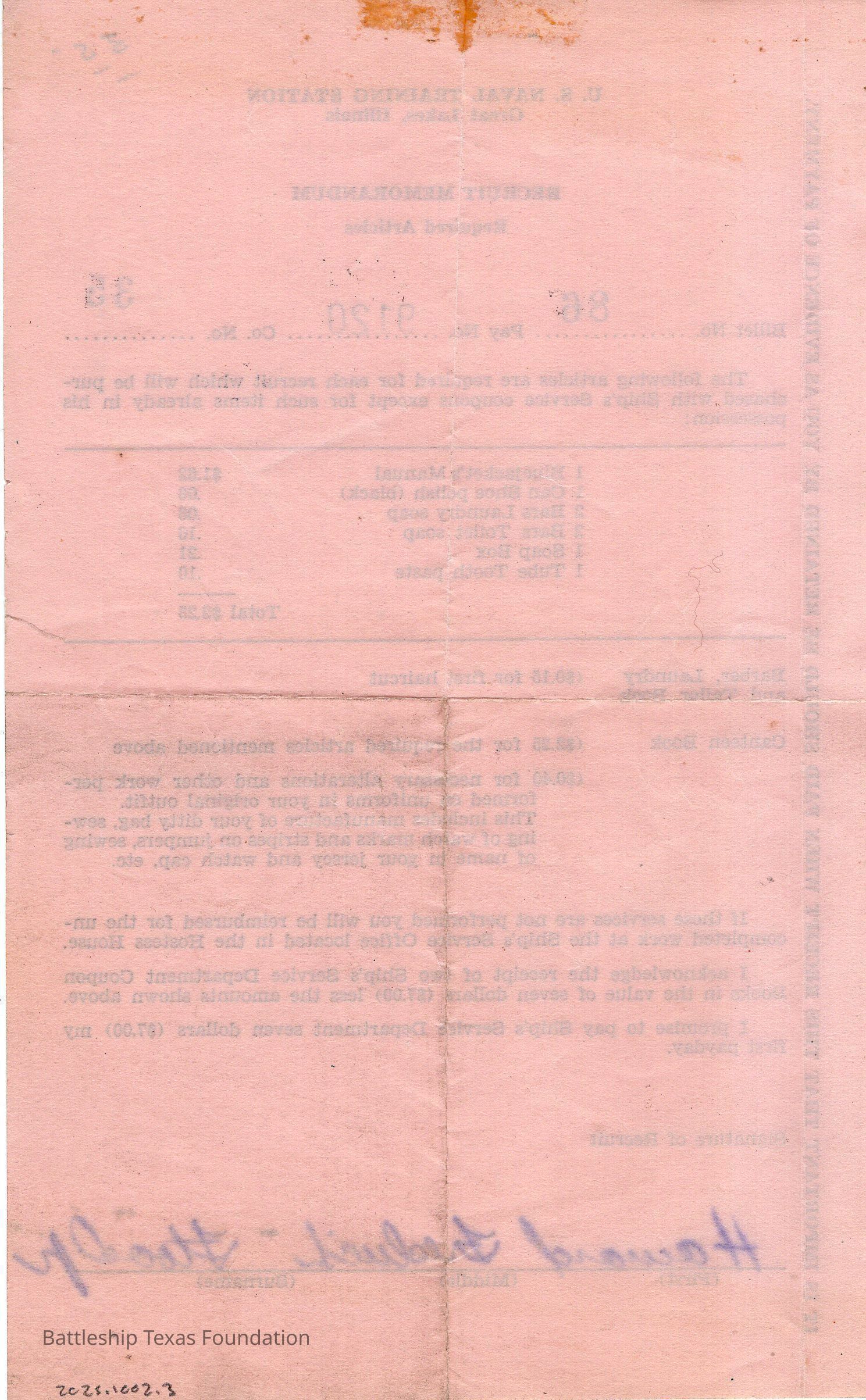 U.S. Naval Training Station from Great Lakes, Illinois detailing the required items recruits must bring. On pink paper. Signed at the bottom of the slip by Flood.Context