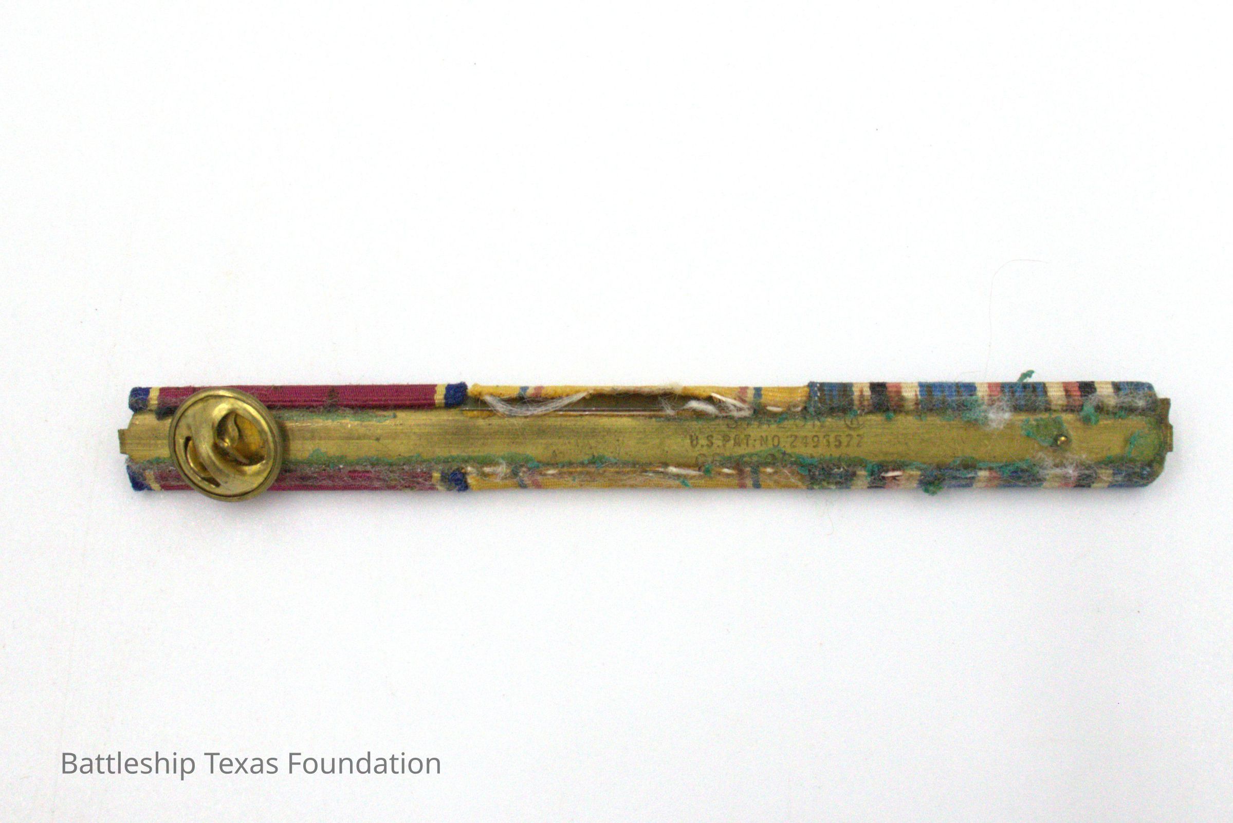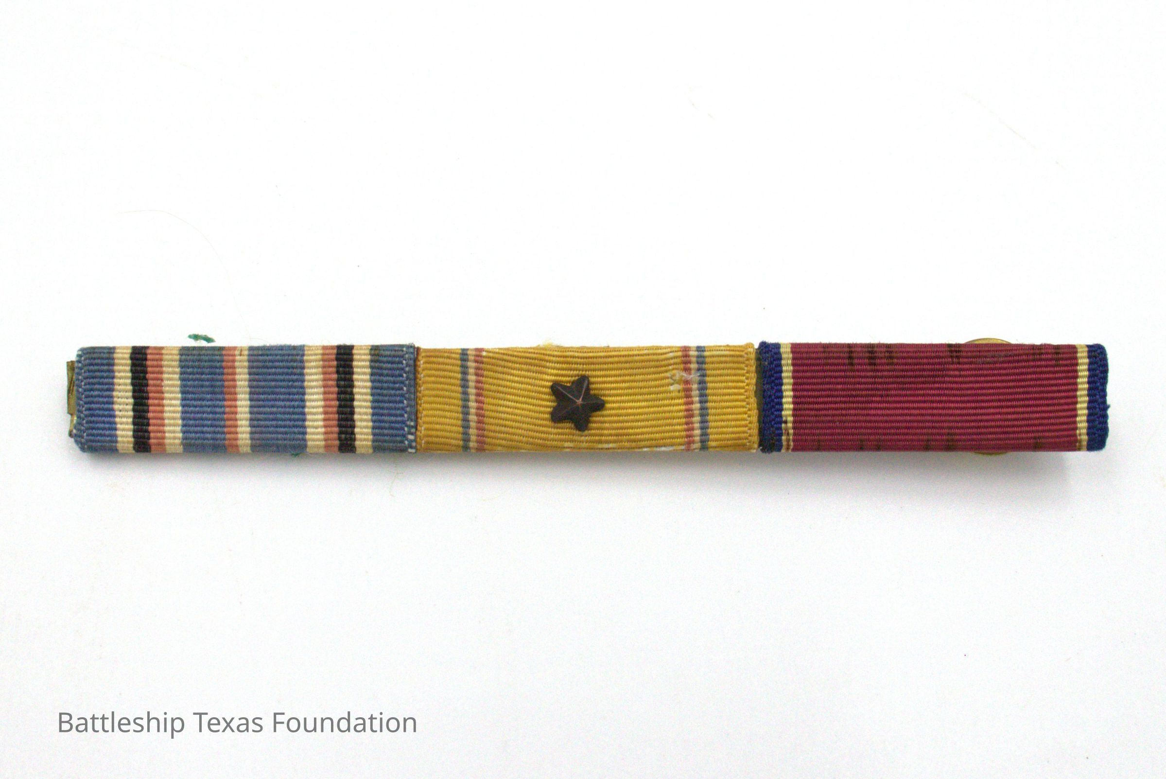 Three medals on ribbon bar. Blue, Yellow with star, and Red. One of back clasps is missing.Context