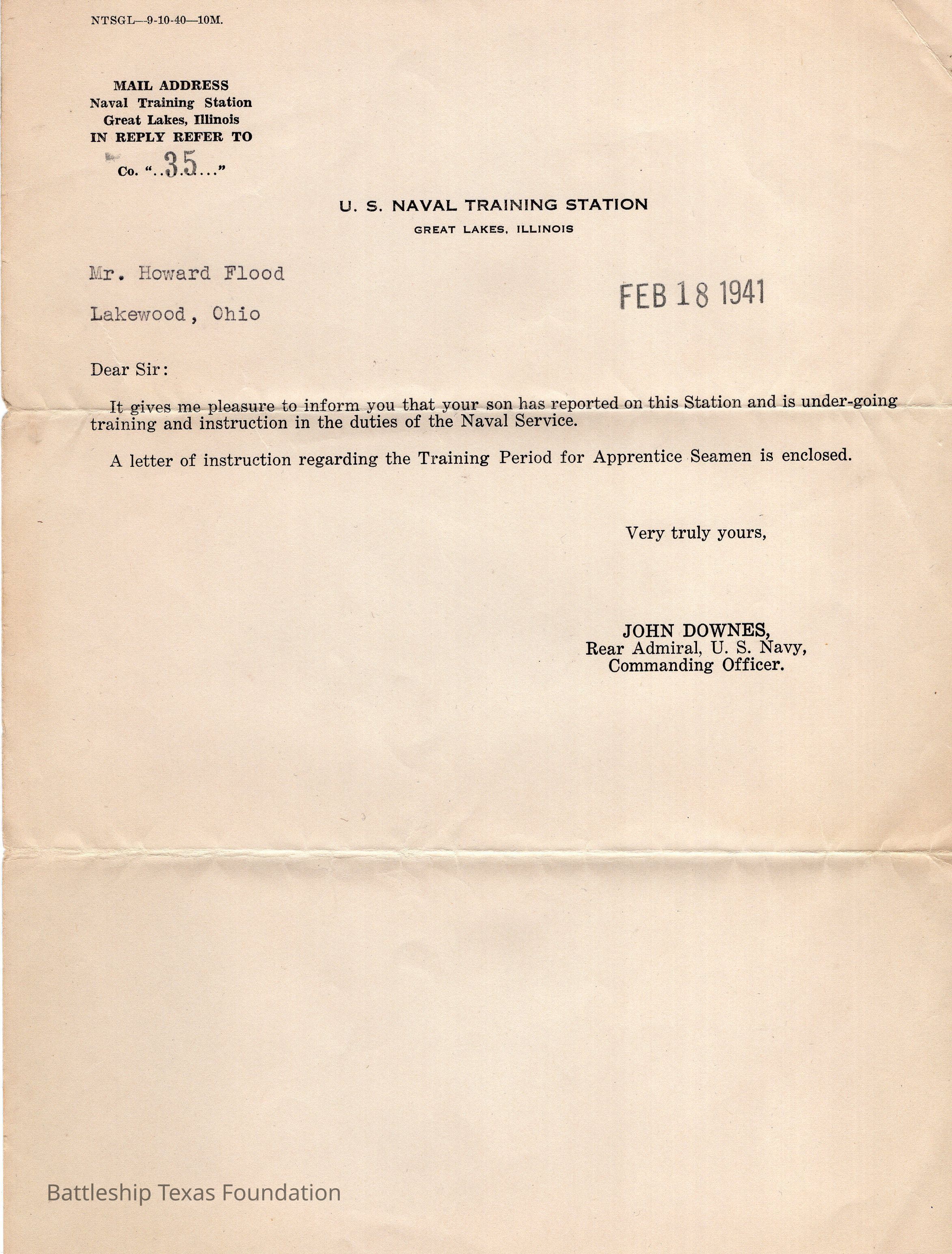 U.S. Naval Training Station notice to the parents of Howard Flood that their son reported for basic training. Notice was stamped "FEB 18 1941." Notice sent from Great Lakes, Illinois.Context