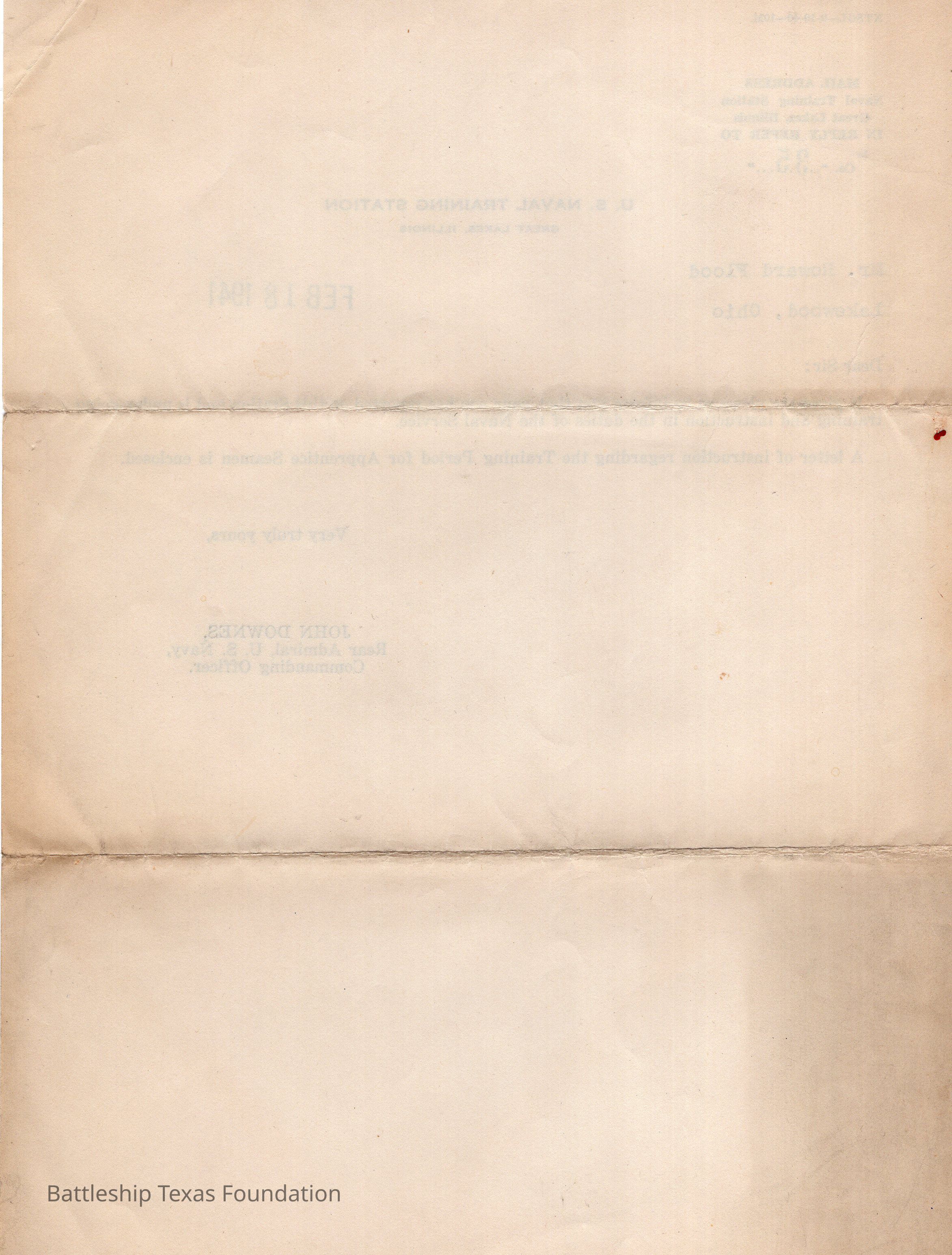 Howard F. Flood Jr. enlisted in the Naval Reserves with parent permission on February 14, 1941, and went through basic training from July 5 to August 3. He went to additional schooling through September 3, 1941. His first assignment was on Battleship Texas.Collection