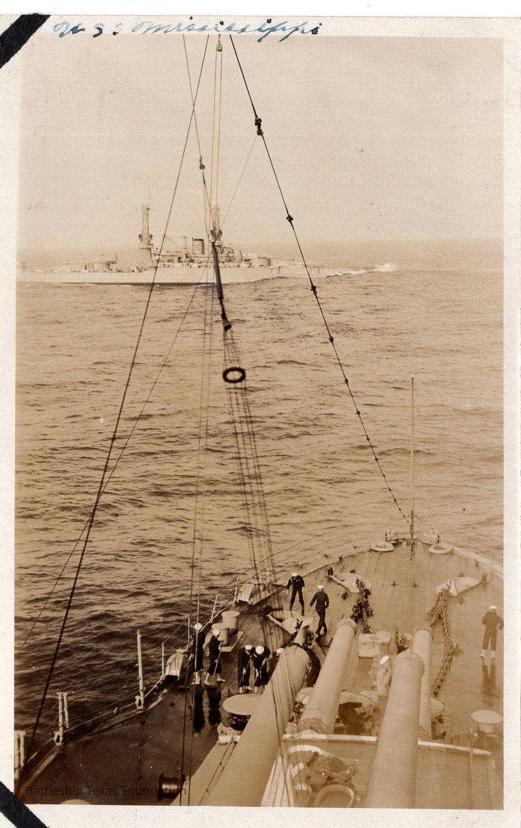 Features bow of Texas sailing on intercept path of USS Mississippi.Context