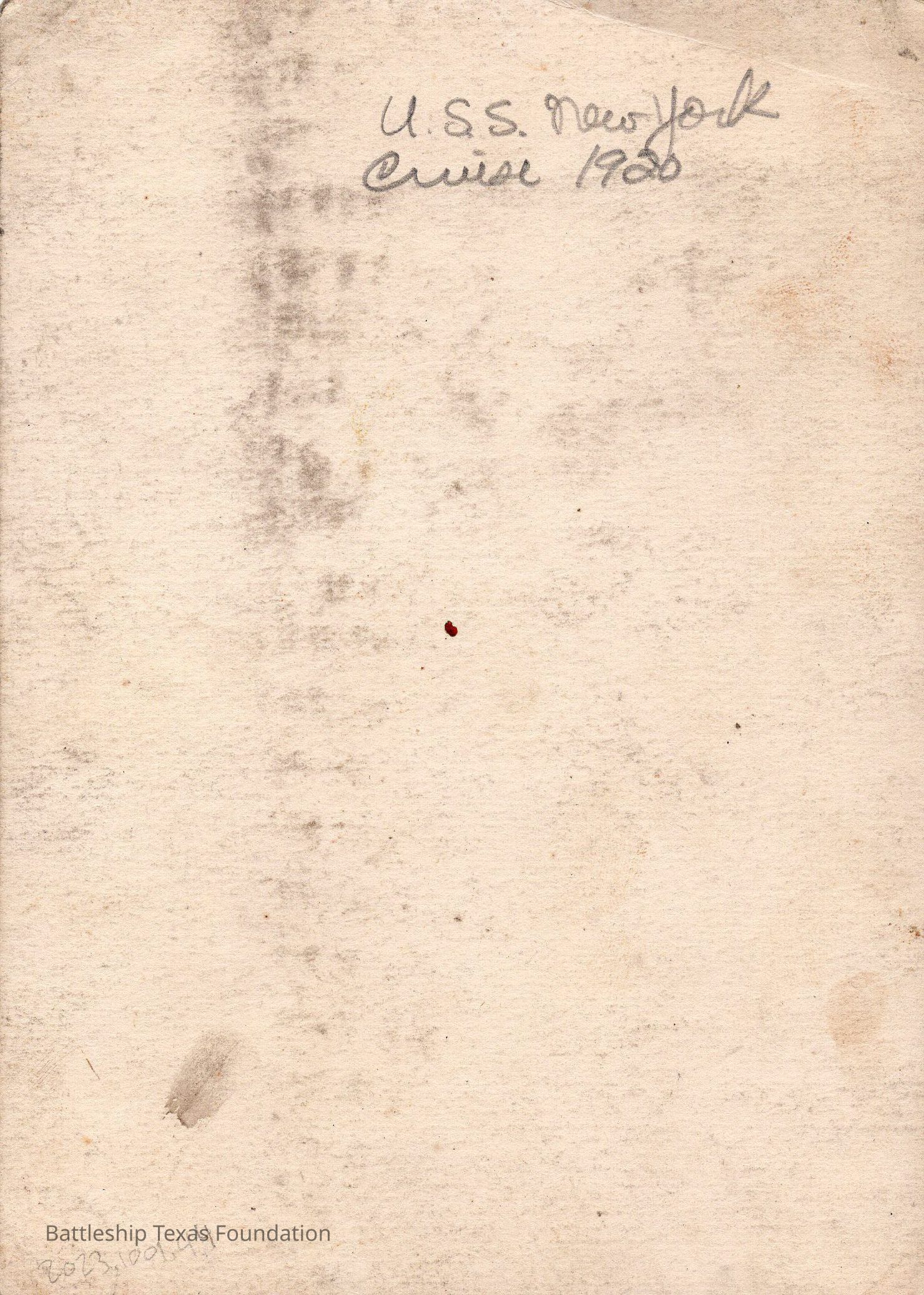 Three men around dynamos. Back says "USS New York / Cruise 1920"Context