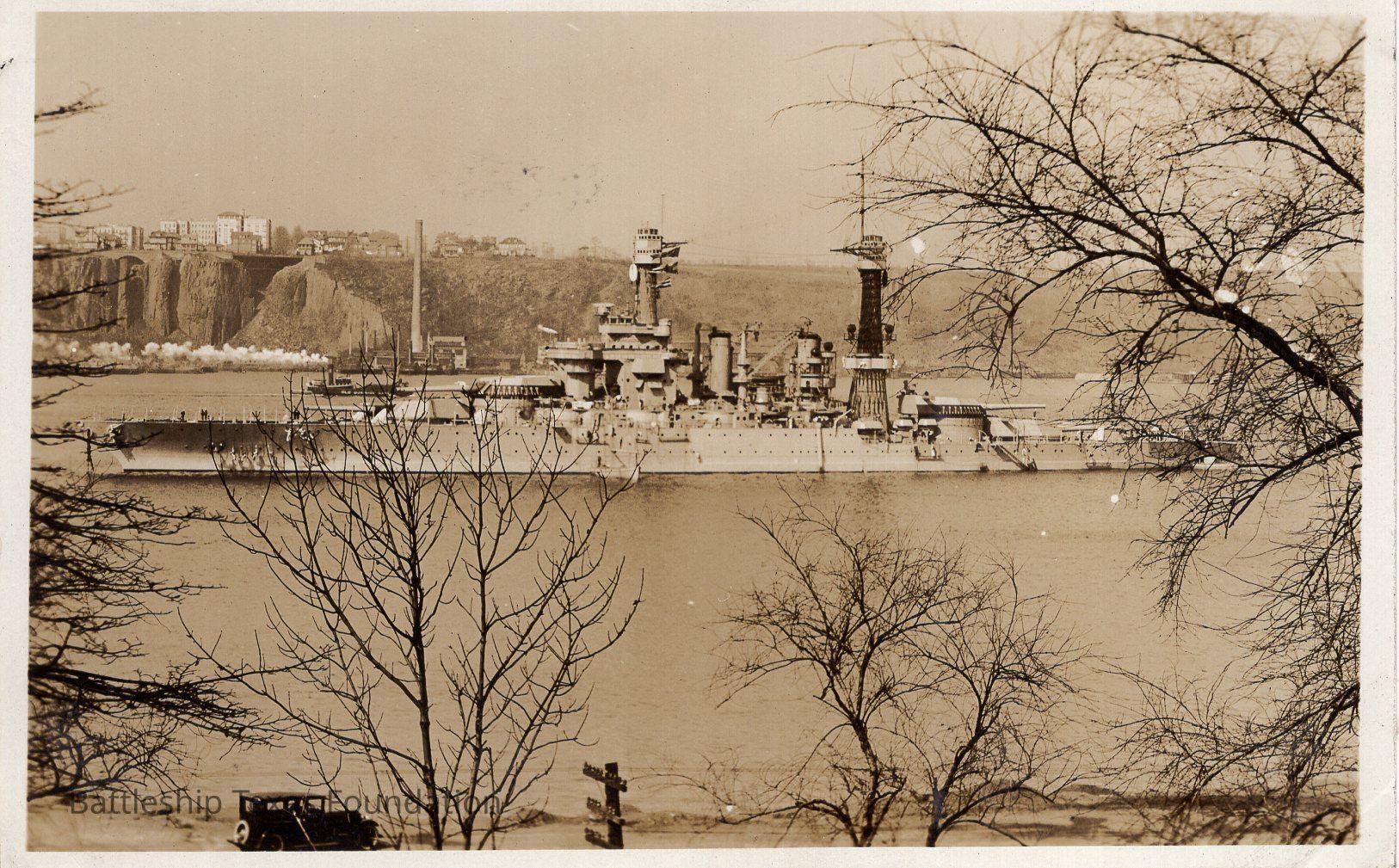 Features USS Tennessee sailing to the left of the photo and obscured by several tree branches in the foreground. Car observers ship’s passage on bottom of photo.Context