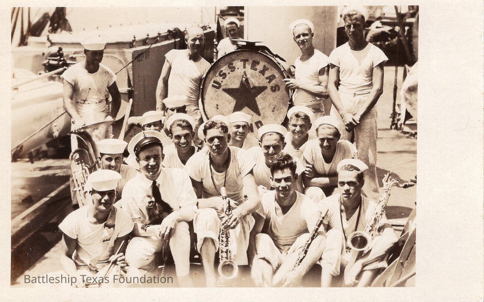 17 men posed around a drum that reads "U.S.S. Texas Band" Back written in pencil says "[signature] & Band / Trinidad Port au Spain / April 1925"Context