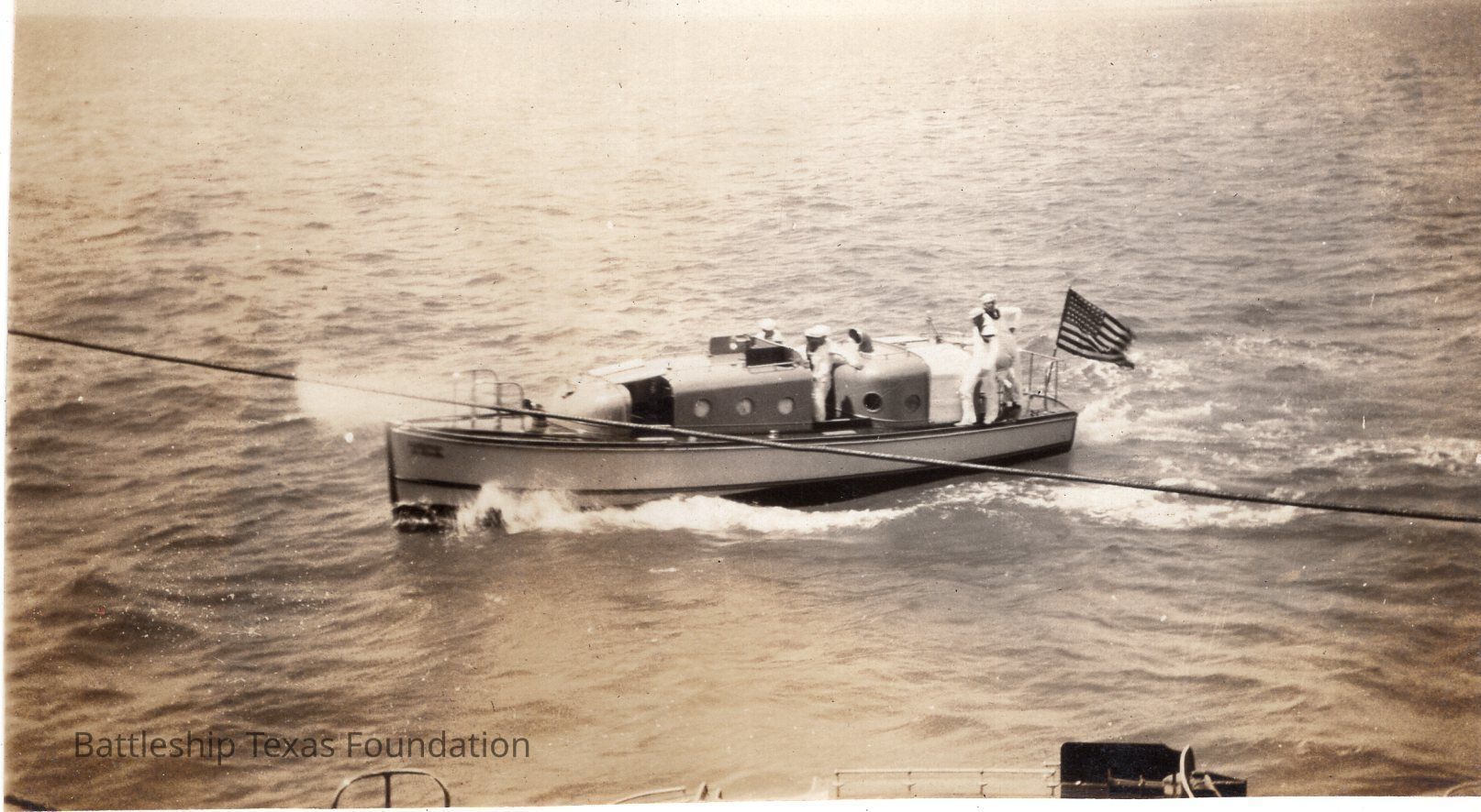 Features one of Texas's utility boats with half a dozen sailors visible on the craft.Context