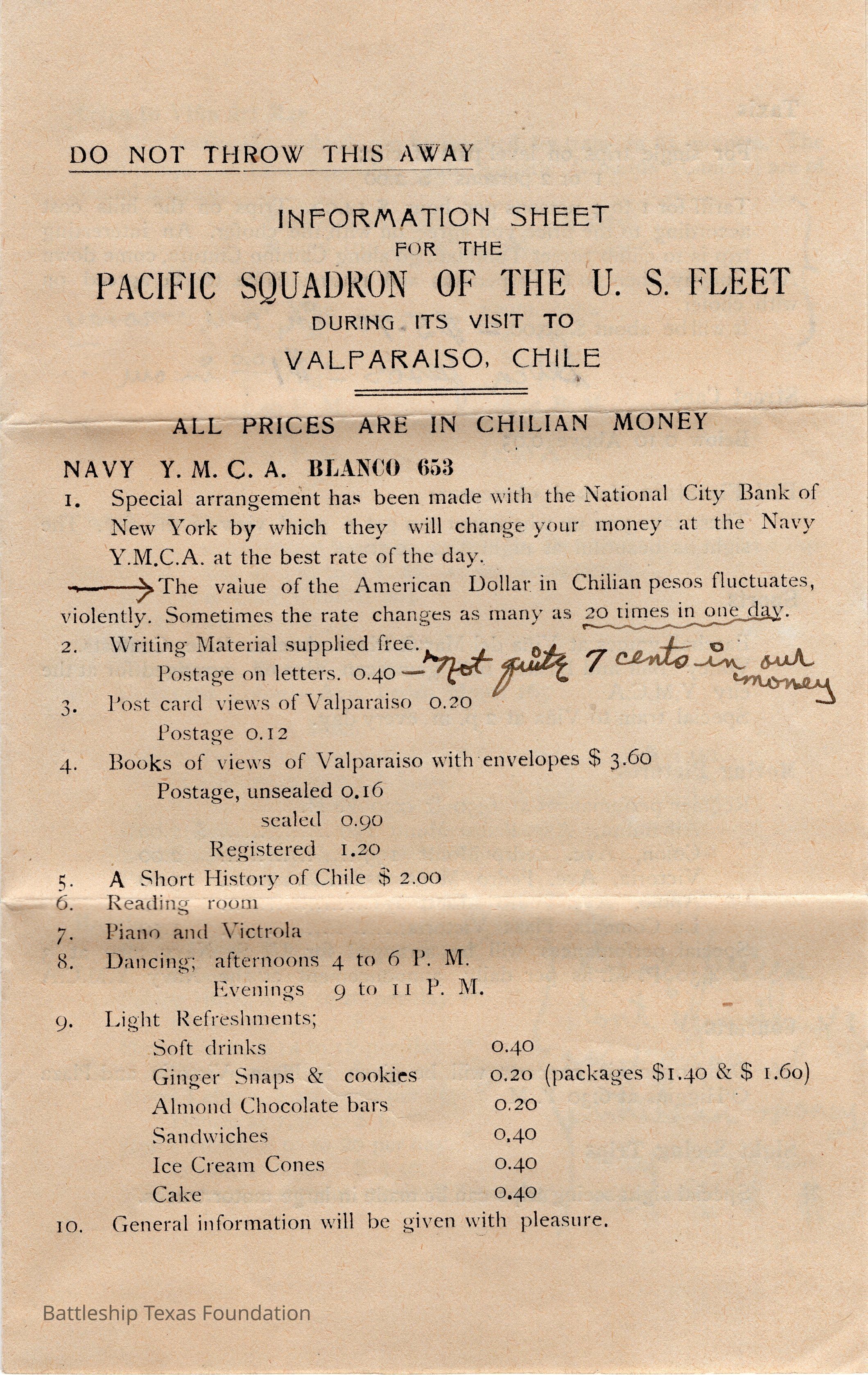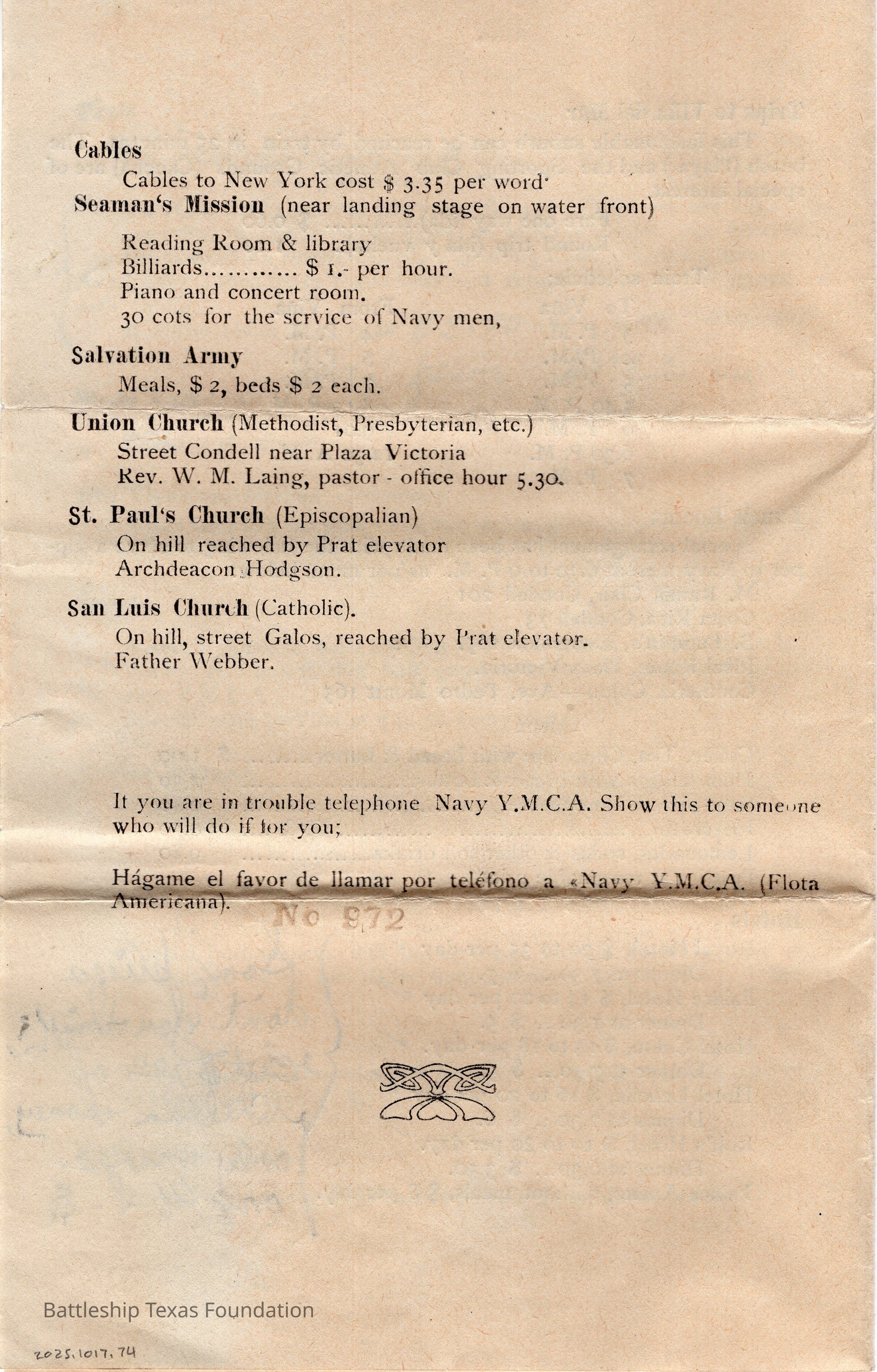 information sheet given to sailors and marines as they made port in Chile. Includes places of interest men can visit while on leave from recreation to religion.Context