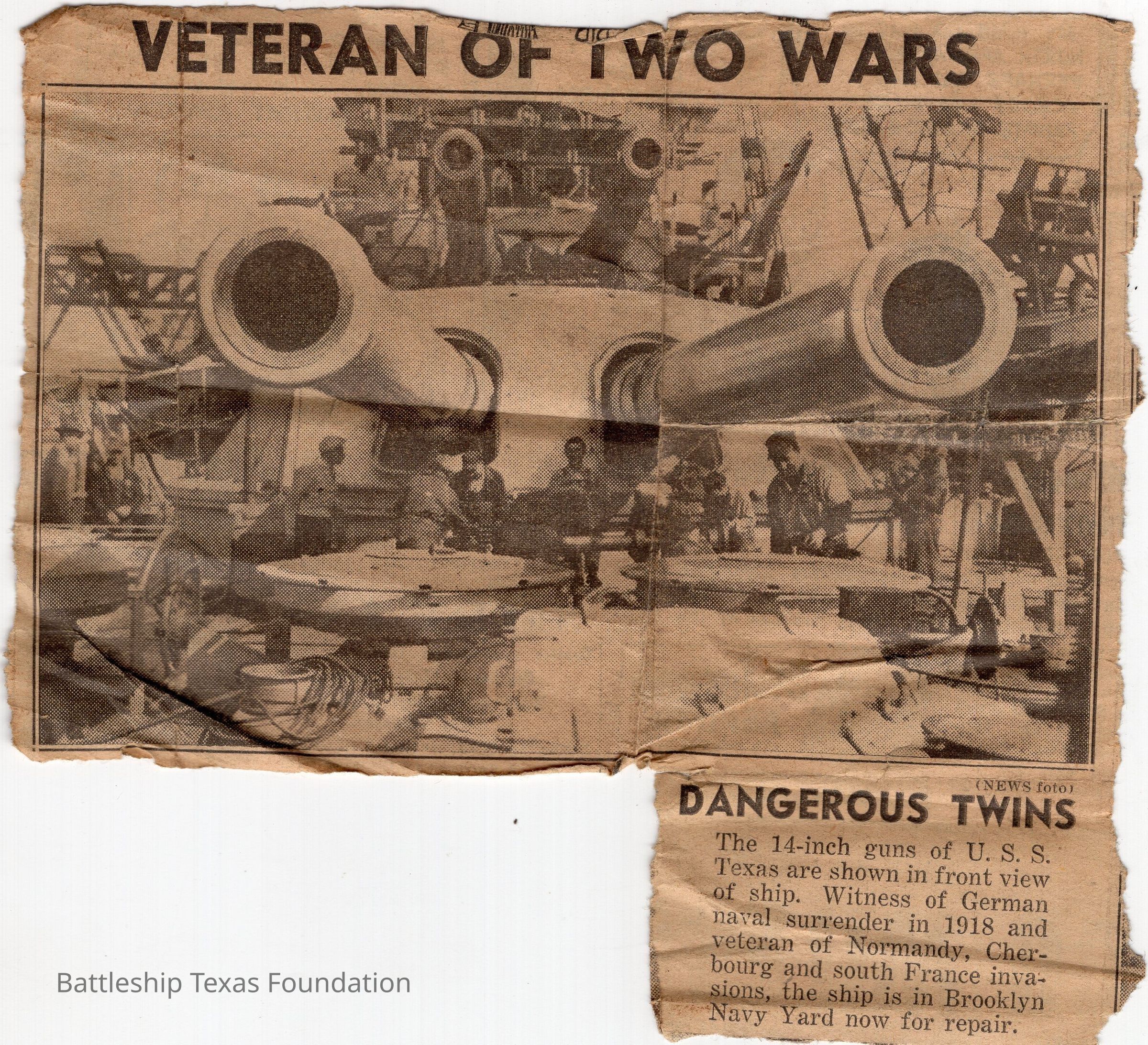 Newspaper clipping of Battleship Texas' actions in North France in article titled "Veteran of Two Wars" and "Dangerous Twins" with photograph of Texas in New York Navy Yard undergoing repairs after the battle.Context
