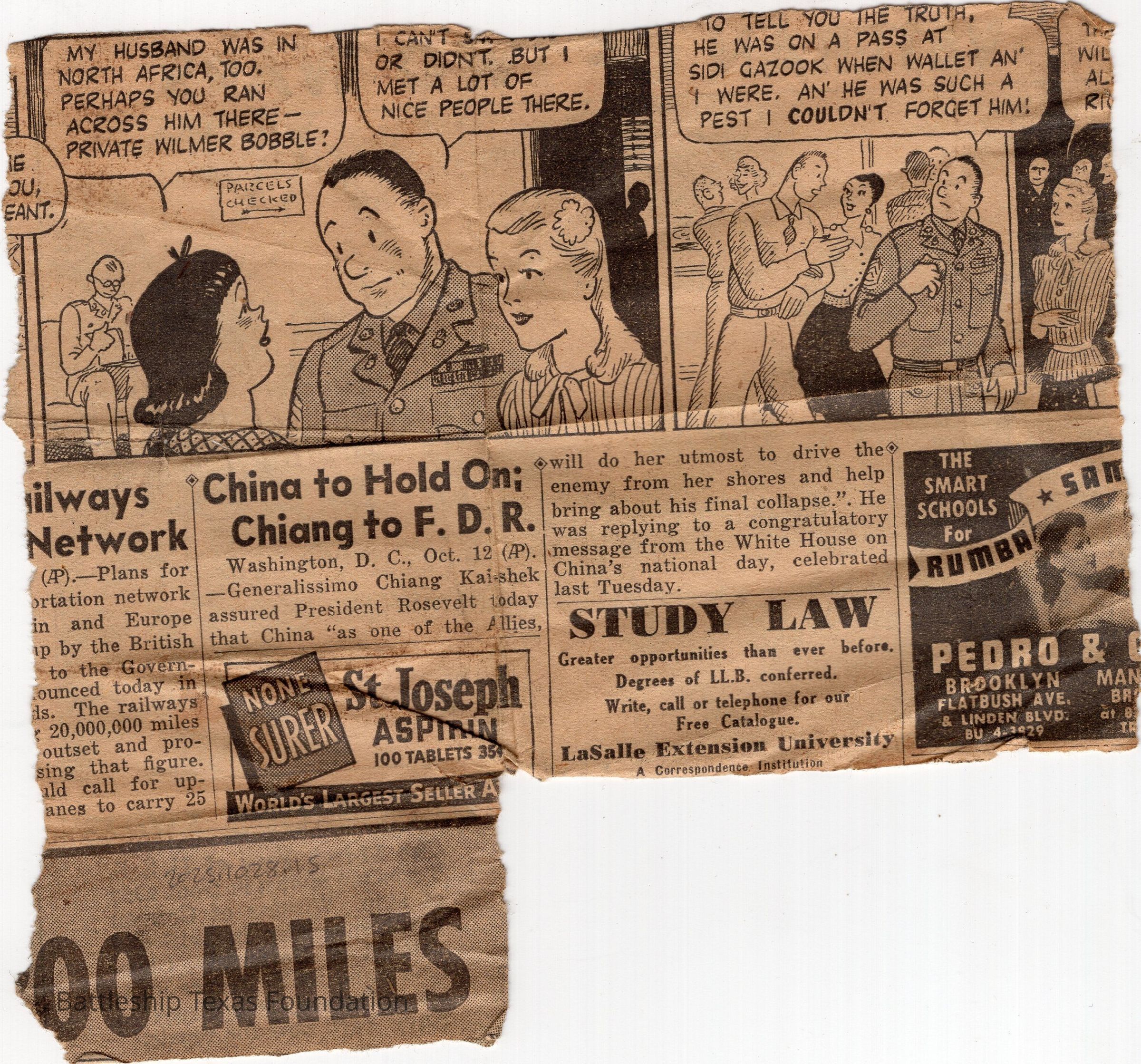 Newspapers often wrote stories about Battleship Texas and her crew. While sometimes inaccurate or sensational, they showed the perceptions of the Homefront, and were collected by civilian and crew alike.Collection