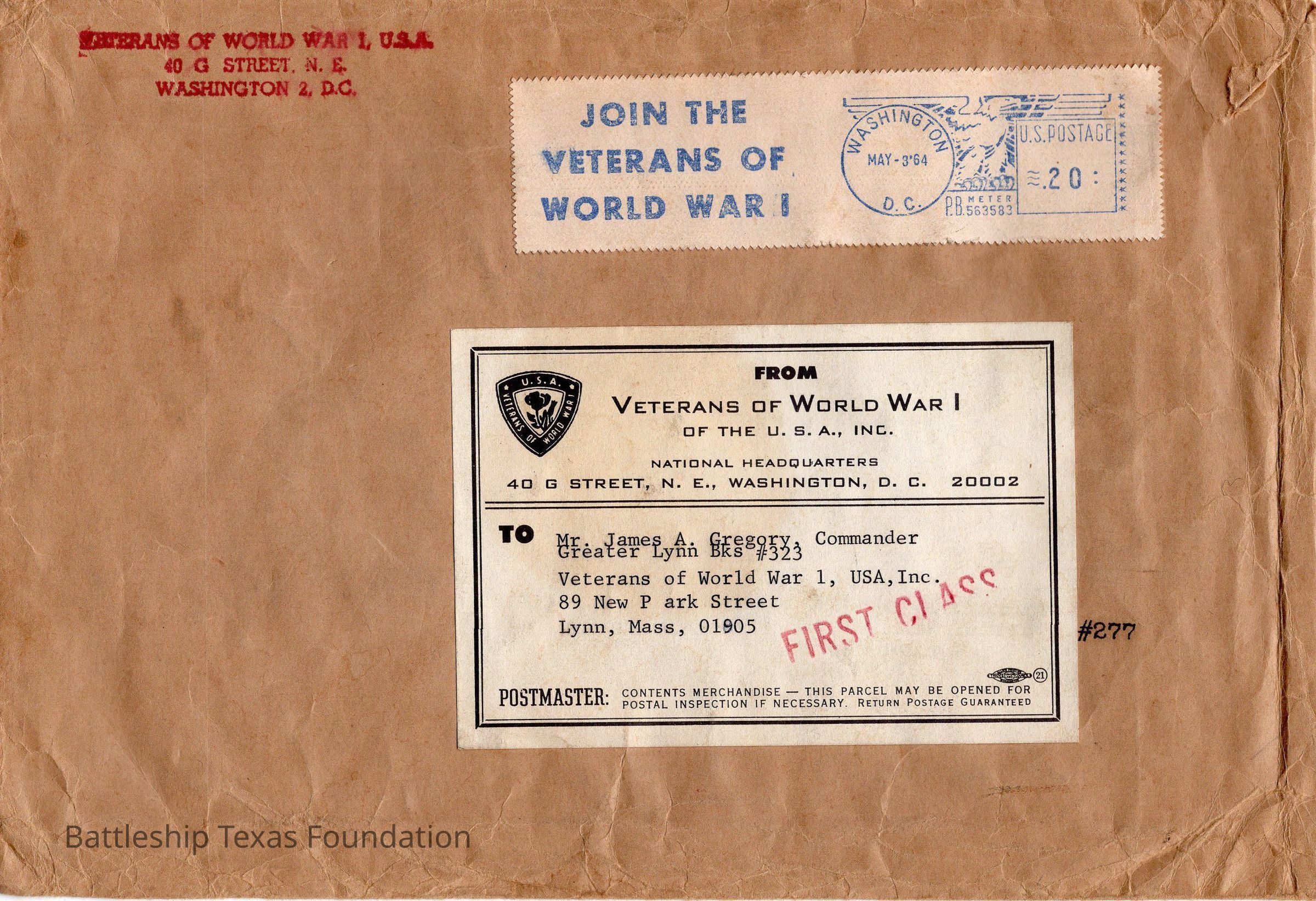 Envelope addressed to James A. Gregory and the same city John Lamson lived in; Lynn, Massachusetts. Shipped First Class, and asking for the recipient to join the Veterans of World War I.Context