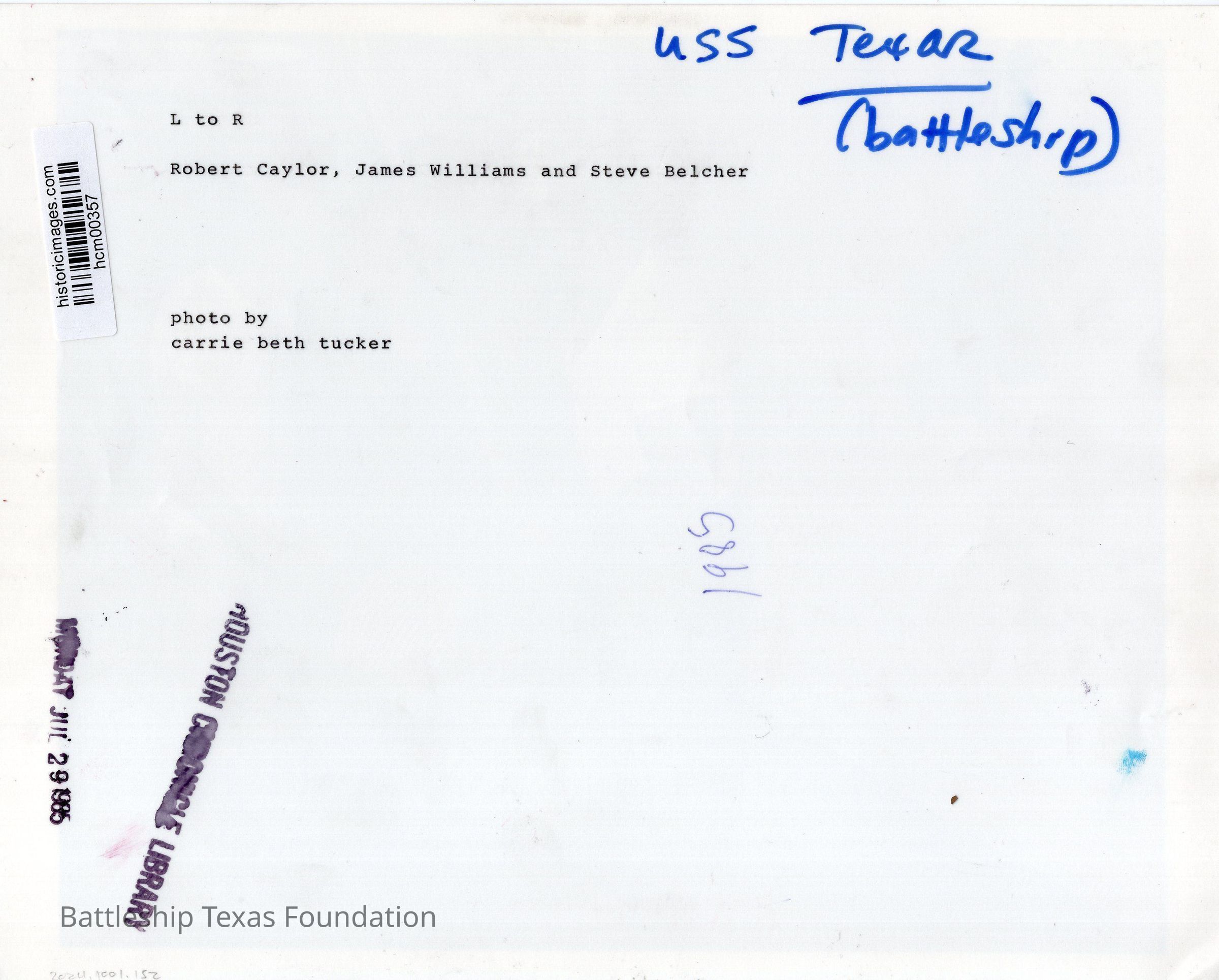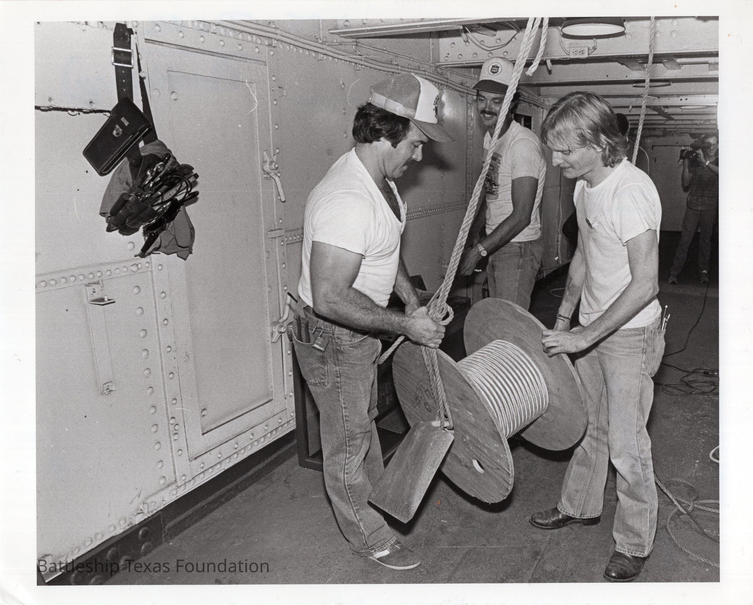 1985 photo of Caylor, Williams, and Belcher working with a rope spool.Context