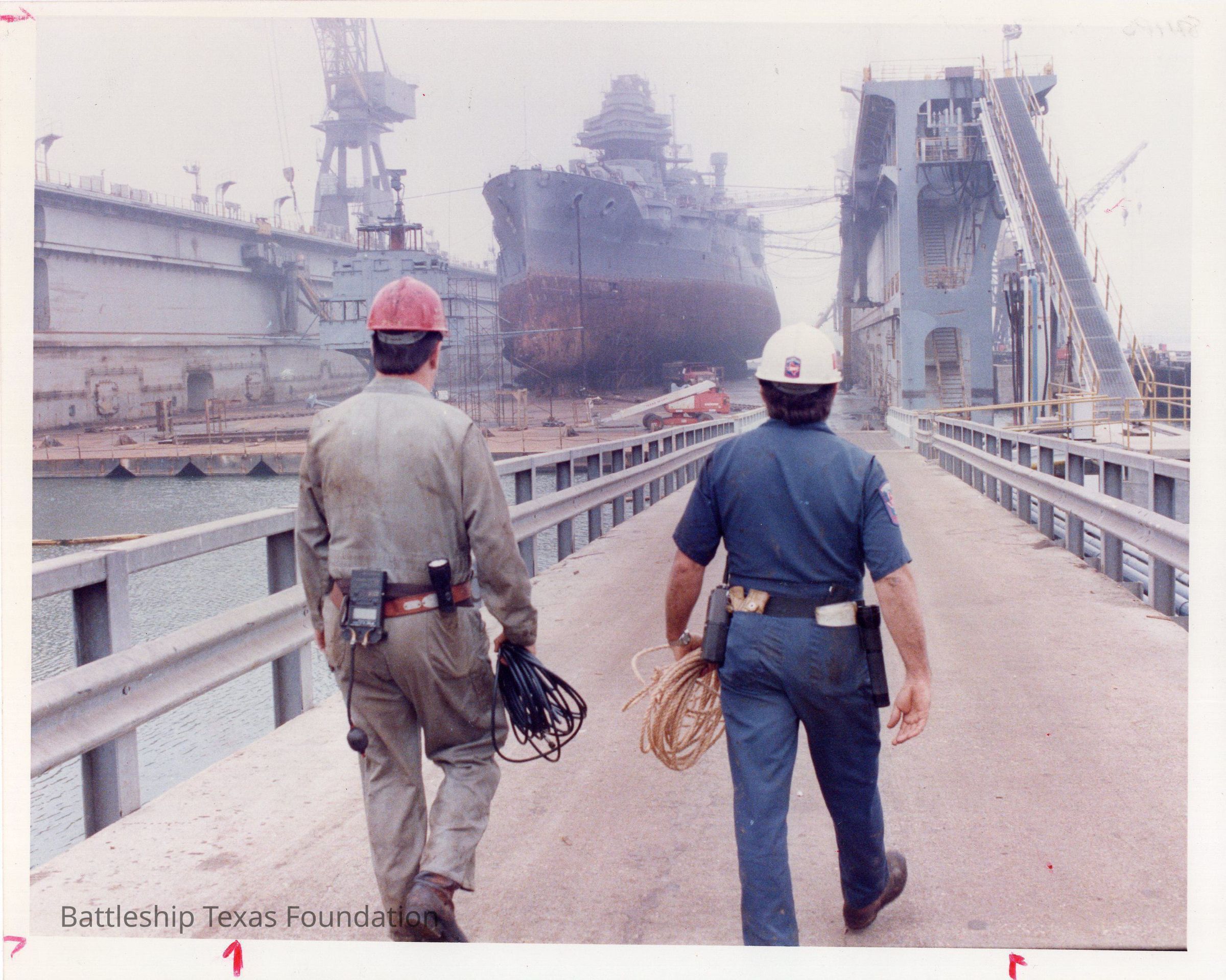 Two men (grey and blue) walk towards Texas at Todd Shipyard. Foretop on dock floor.Context