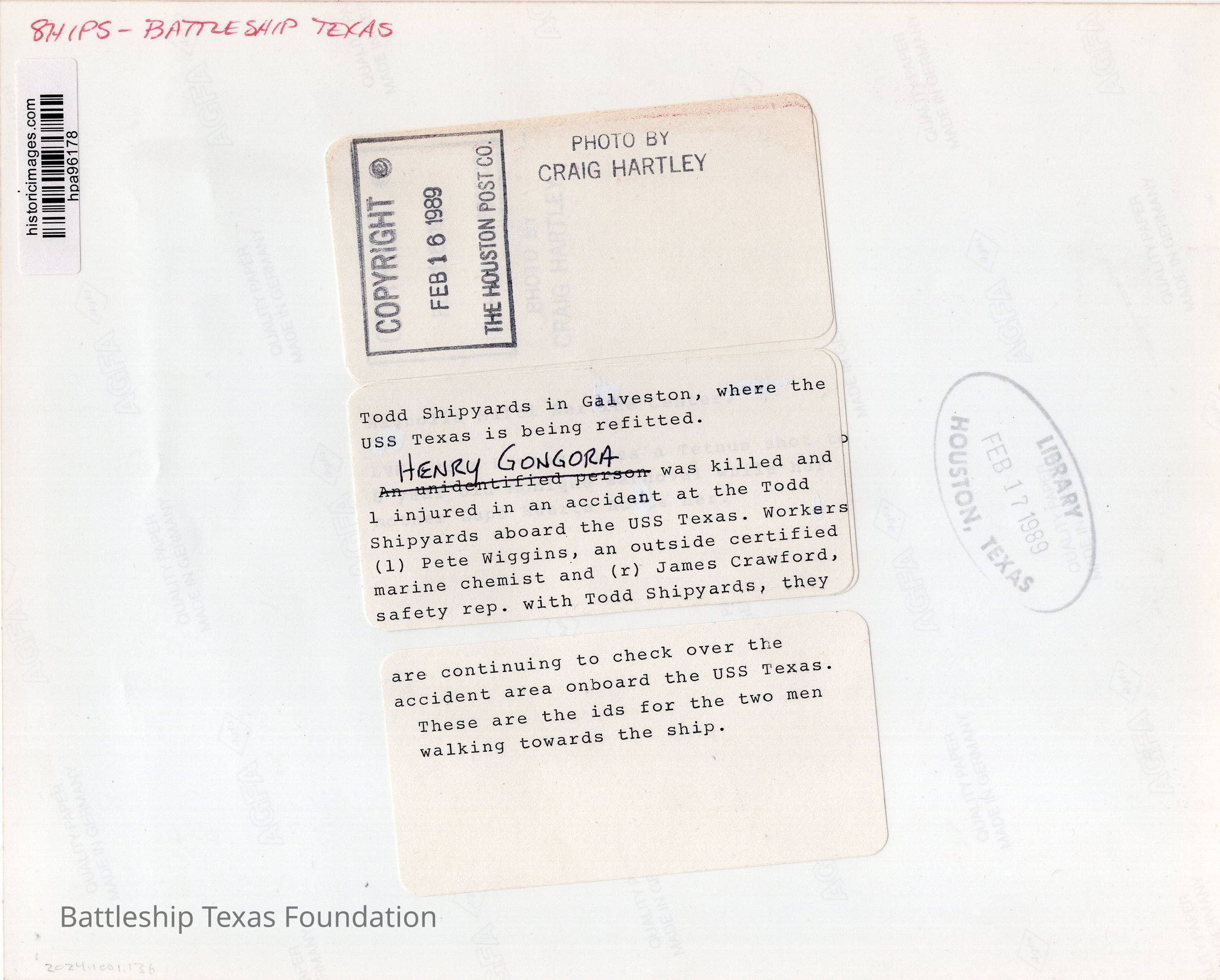 Battleship Texas departed San Jacinto State Park for Todd Shipyard in Galveston where she had hull work in dry dock from December 13, 1988, to August 6, 1989, and then put back in water for additional work through February 23, 1990. She was moved to Green’s Bayou for decking and monopile instillation and returned to San Jacinto Battleground on July 28, 1990. The Battleship Texas Museum was operated by the Texas Parks and Wildlife Department from 1983 to 2020.Collection